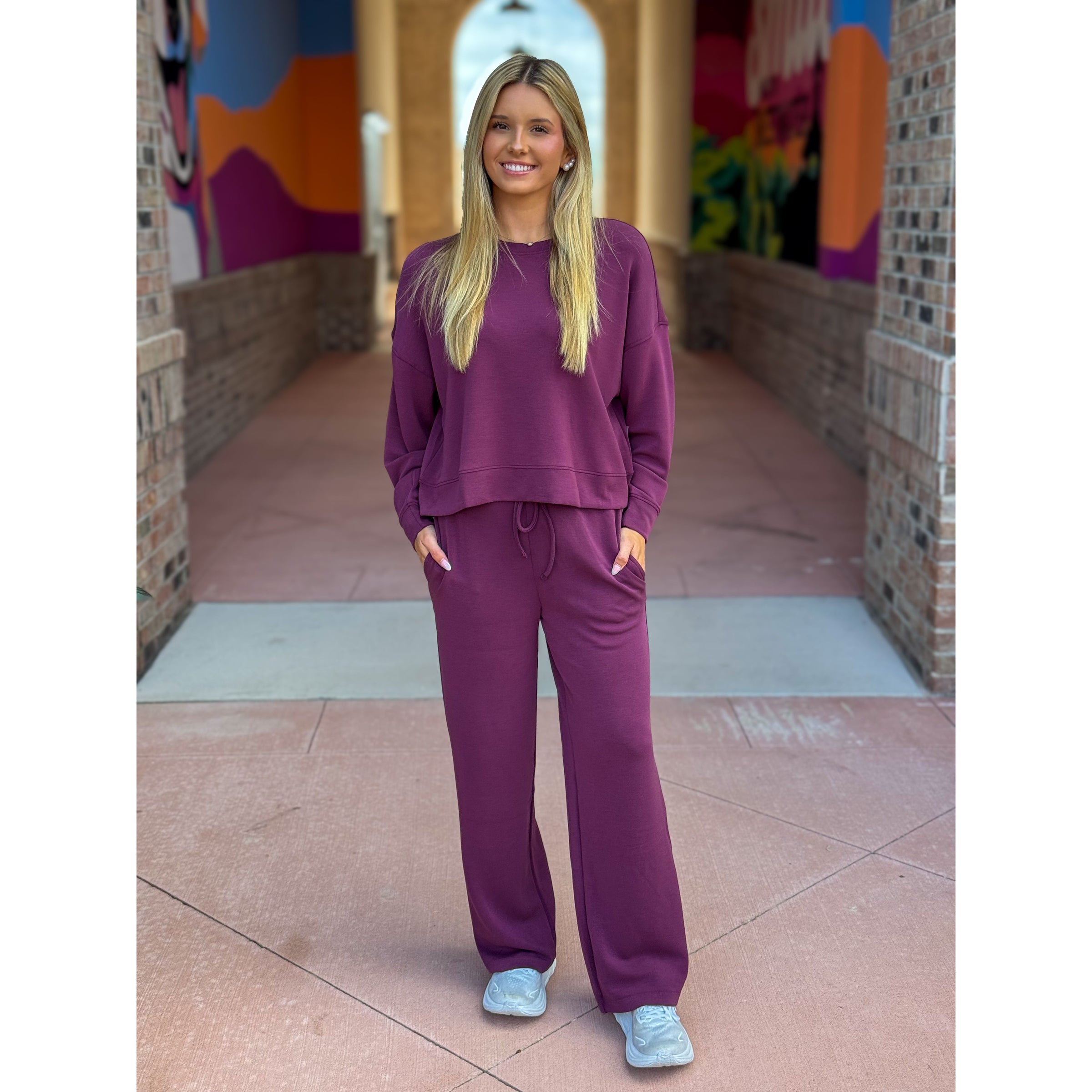 Slip into the Laguna Wide Leg Pant in Dark Plum—your new go-to for effortless style and comfort. Made from buttery-soft scuba fabric, these pants are sure to become a favorite! The drawcord tie lets you customize your fit, while the wide leg design keeps things relaxed and flattering. Perfect for pairing with a white tee or the matching sweatshirt, these pants bring playful ease to any outfit. Don't miss the coordinating Laguna Dropped Shoulder Sweatshirt also available in Dark Plum.