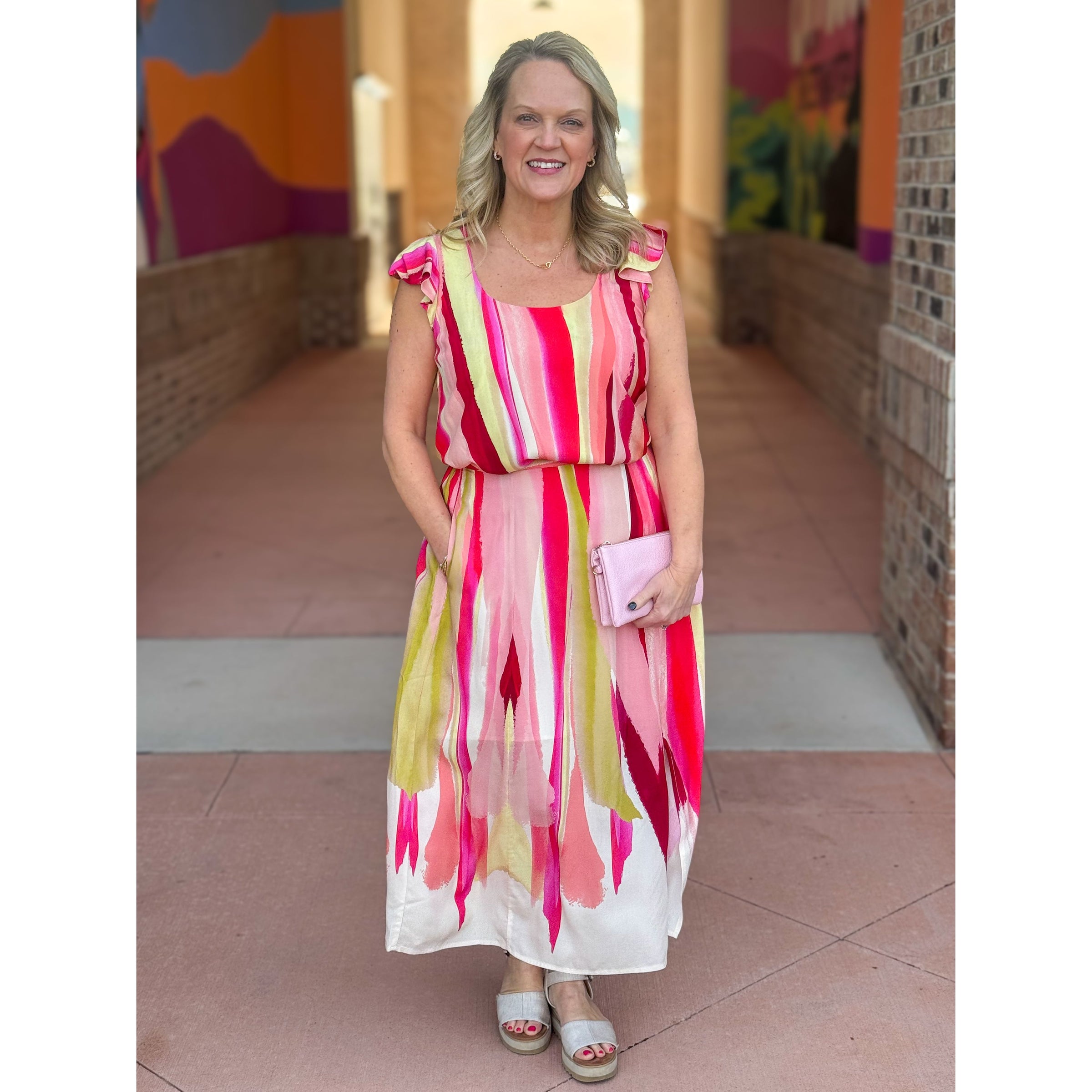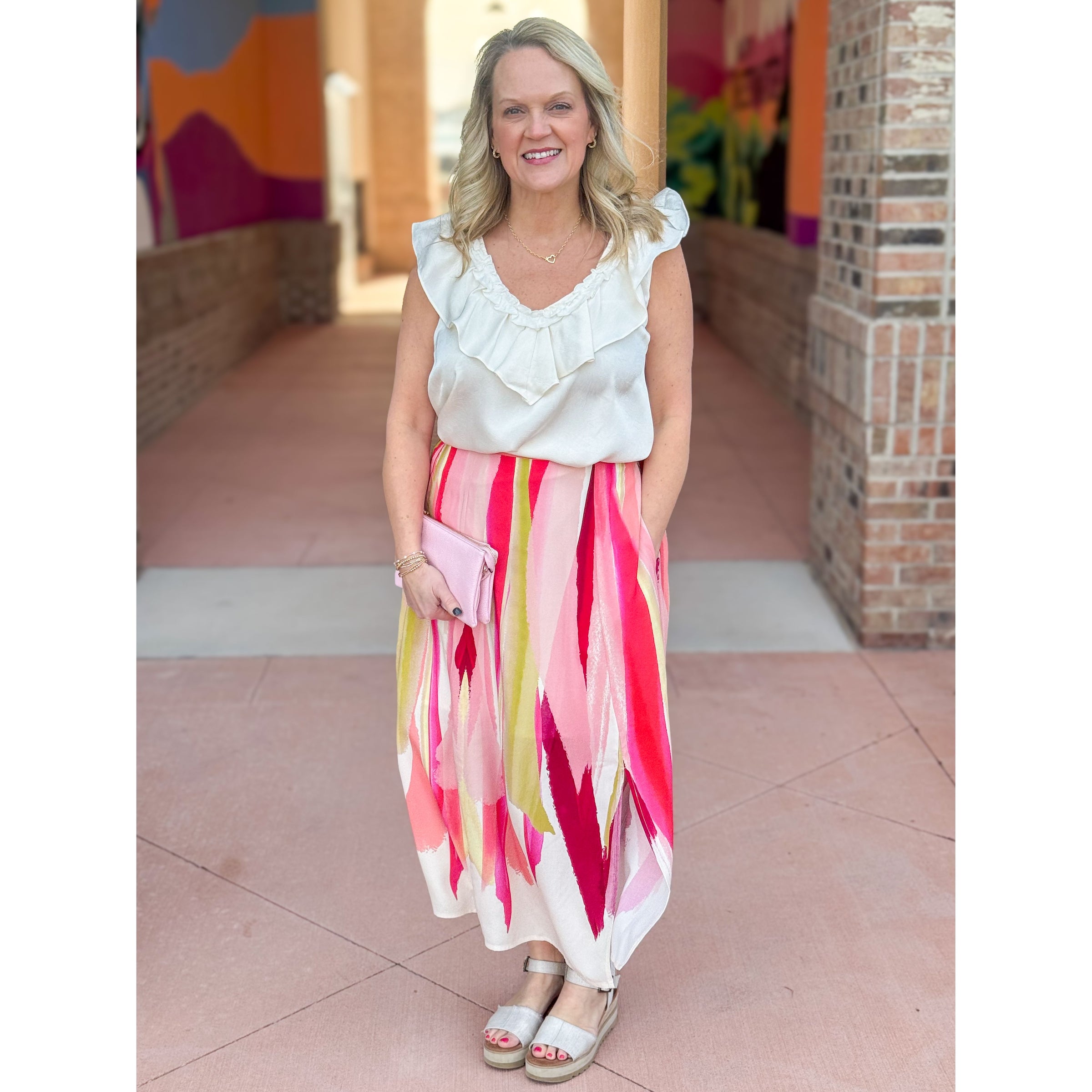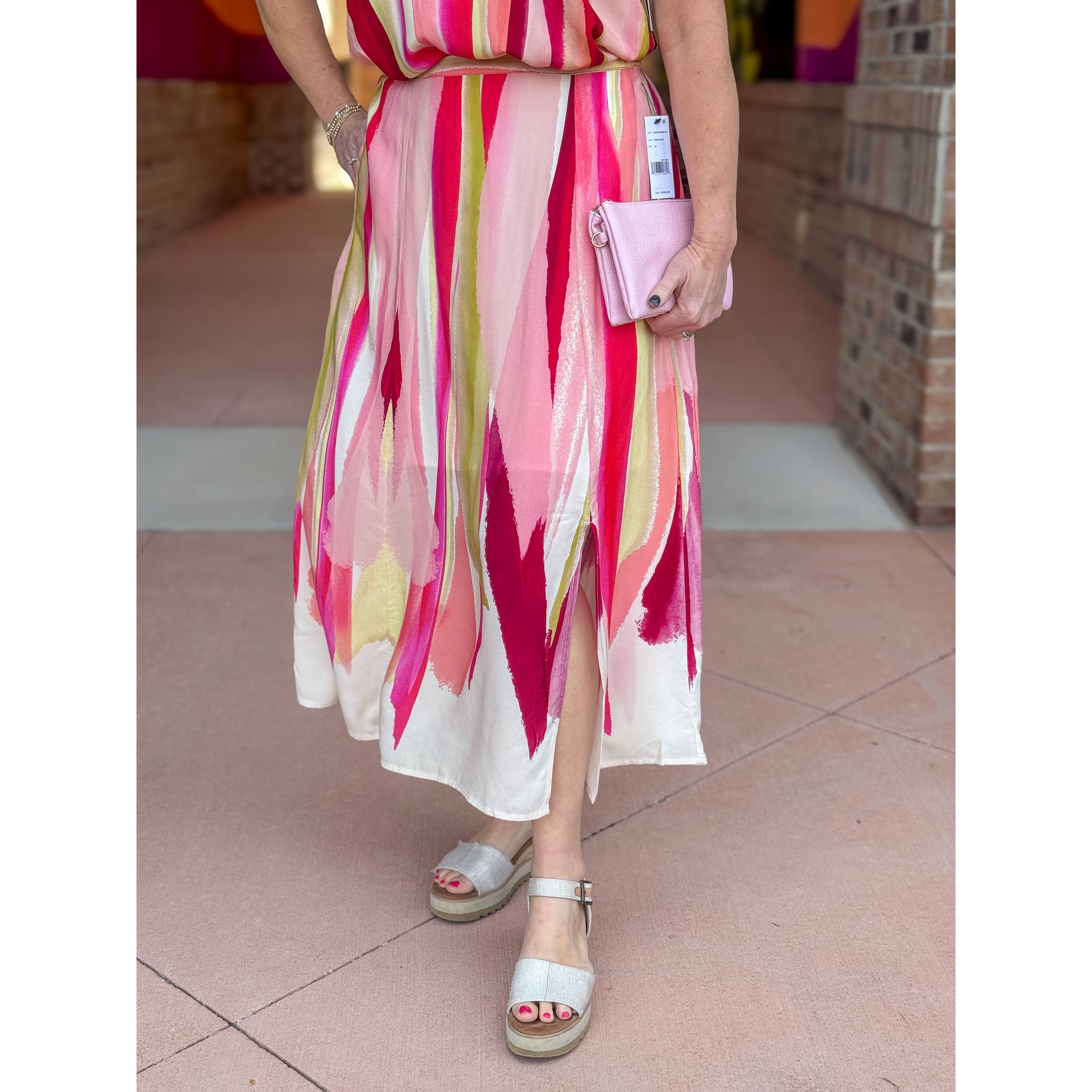 Effortless elegance meets everyday comfort in this pull-on maxi skirt. Crafted from flowing woven fabric with a vibrant pink multi-striped pattern, it features a lined interior, functional side pockets, and a flattering side slit. The elasticized back waist ensures a perfect fit without fussing. Consider pairing with the Liverpool Los Angeles' Flutter Sleeve Scoop Neck Top for a polished, coordinated look.