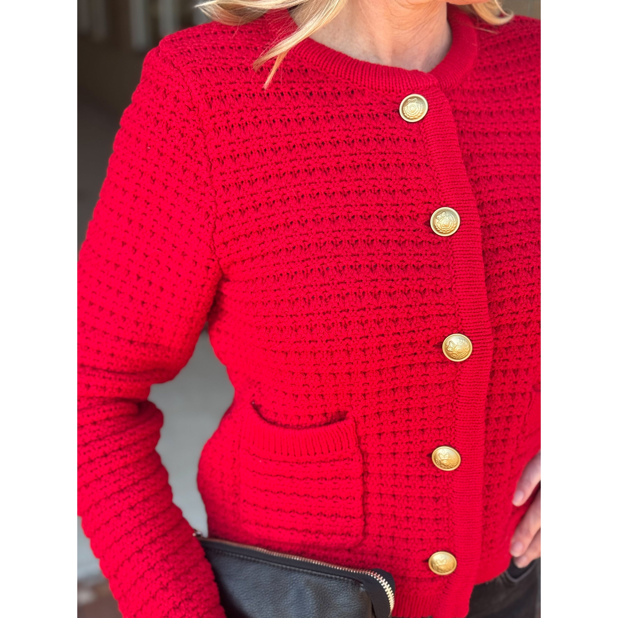 Elevate your wardrobe with the Cambria button up long sleeve cardigan sweater in the rich red salsa color. Designed for comfort and style, this sweater boasts a classic fit for ultimate comfort and easy layering, whether you're lounging at home or stepping out for a casual outing.