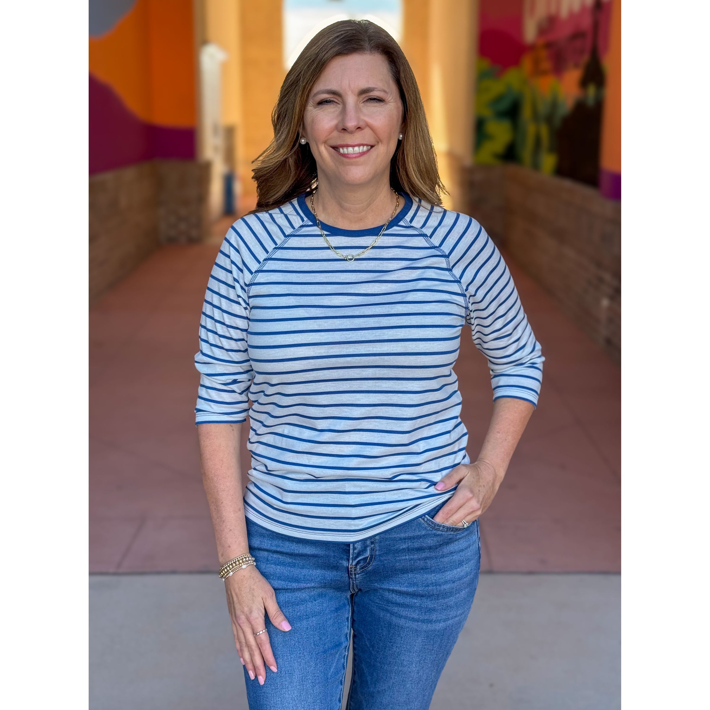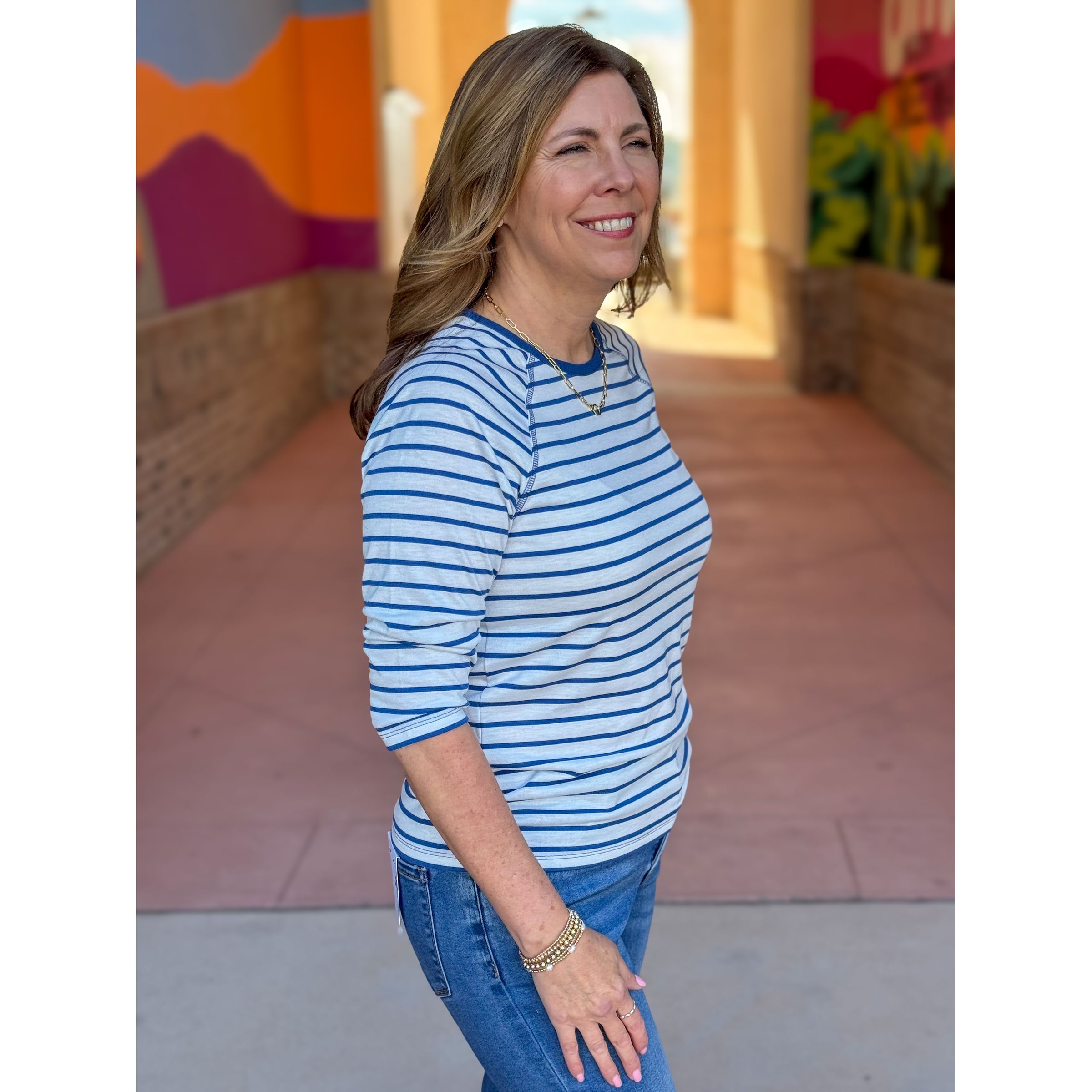 Dear John's Sonoma Top delivers timeless appeal through thoughtful construction. The soft knit fabric drapes beautifully with 3/4 raglan sleeves that move with you, while a round neckline and semi-fitted silhouette create a balanced, flattering shape. The Riviera Stripe pattern introduces gentle visual texture without demanding attention. A foundational piece that pairs effortlessly with your existing collection.
