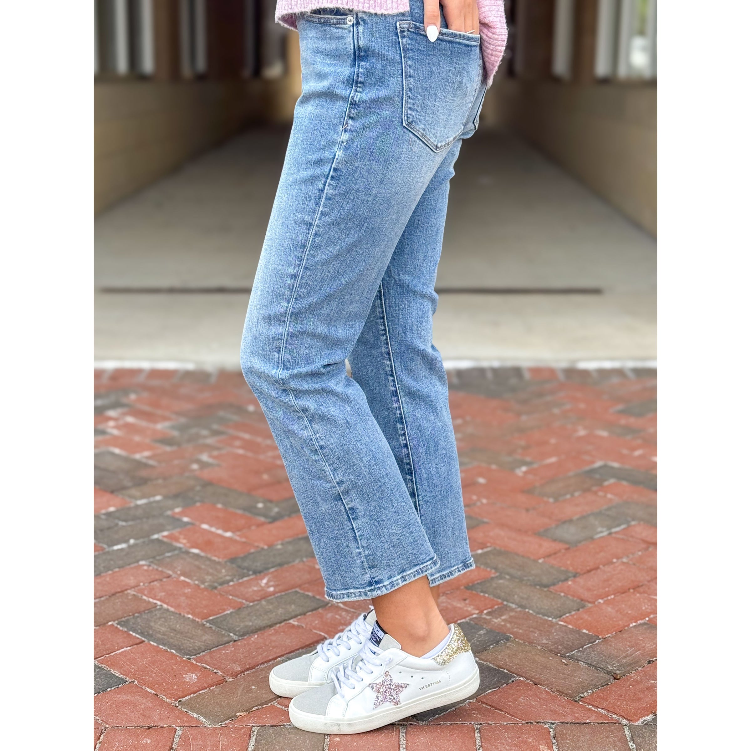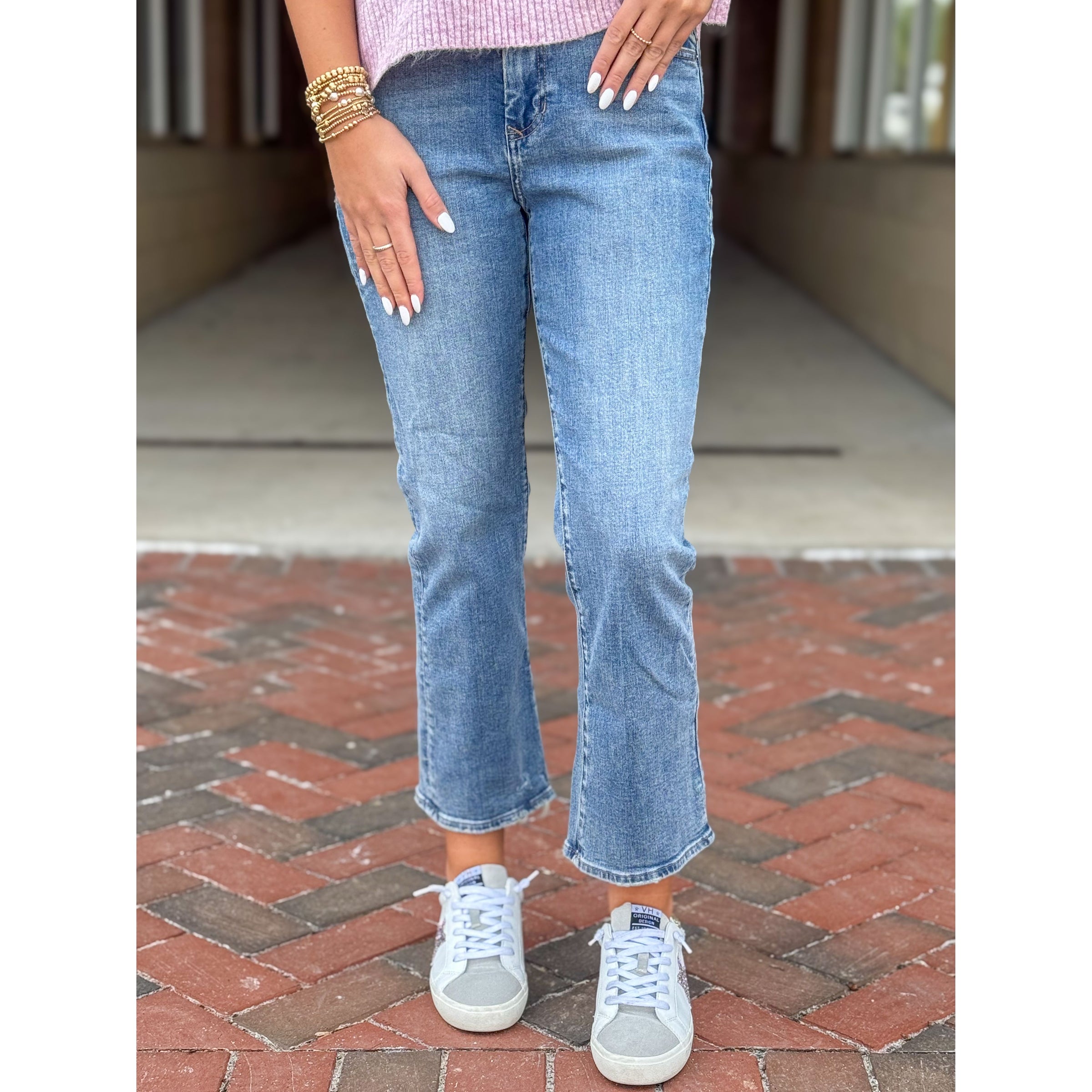 Upgrade your denim game with Dear John's Jeanne Flare Jeans in this popular medium wash. These refined jeans boast a mid-rise fit and a slightly distressed hem, giving you effortless chic style. Made with a premium blend for comfort and stretch, these jeans are your go-to for a contemporary and versatile look. Get your "flare" on!