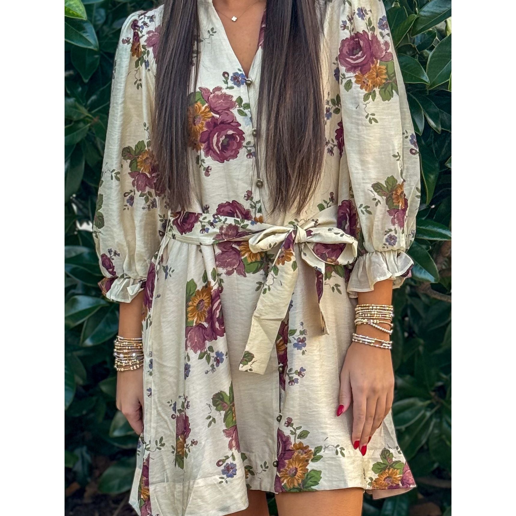 Effortless elegance meets playful charm in this Ophelia Floral Print Mini Dress. The ruffled neckline adds unique detail while the tie waist creates a refined silhouette, and balloon sleeves add movement and dimension. Perfect for transitional seasons, this piece balances feminine details with understated sophistication. Pair with your favorite flats or boots and some gold jewelry for multiple ways to step out in style this season.