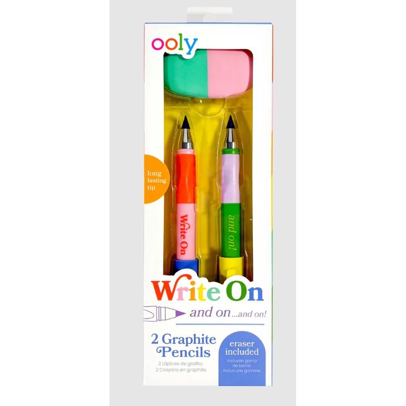 Ready, set, sketch! The Write On Graphite Pencil Set gives a sleek upgrade to your standard pencil pack. Made of solid graphite from tip to tail, these pencils last longer, sharpen cleaner, and deliver a satisfyingly smooth writing experience. With two bold, woodless graphite pencils and one colorful eraser, this 3-piece set is made for big thinkers, tiny doodlers, and everyone in between.