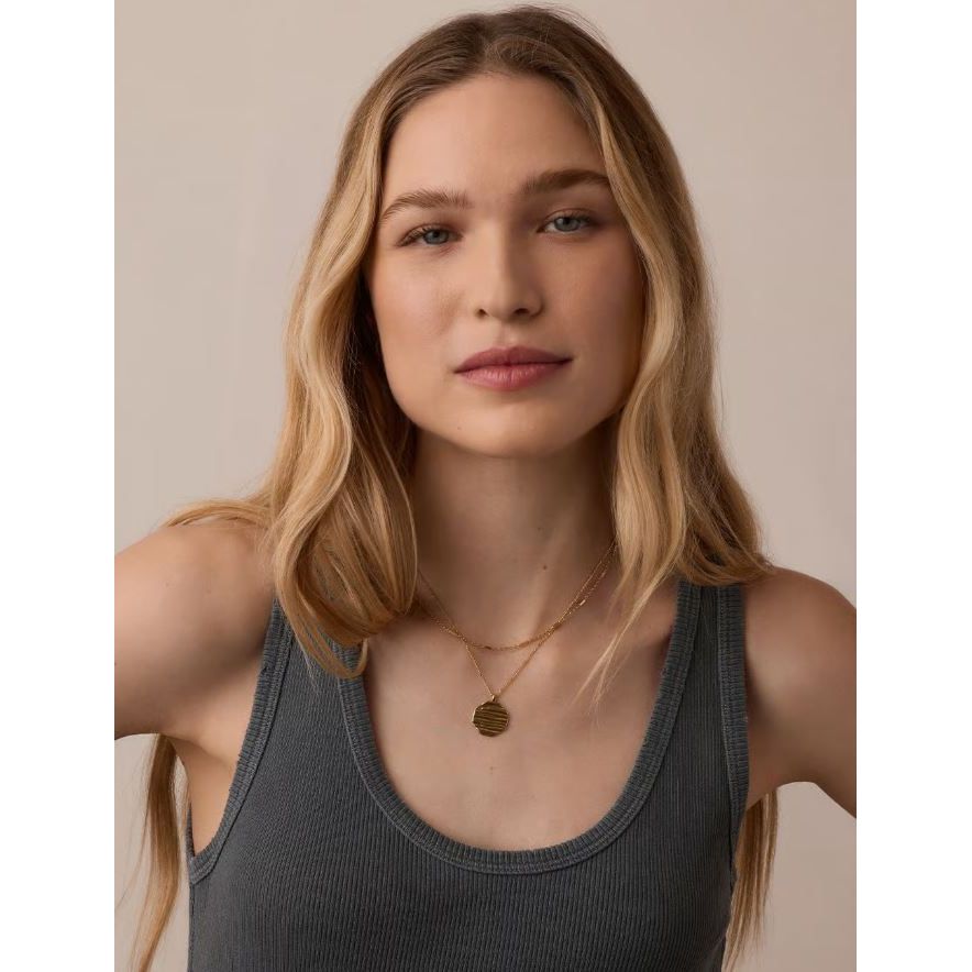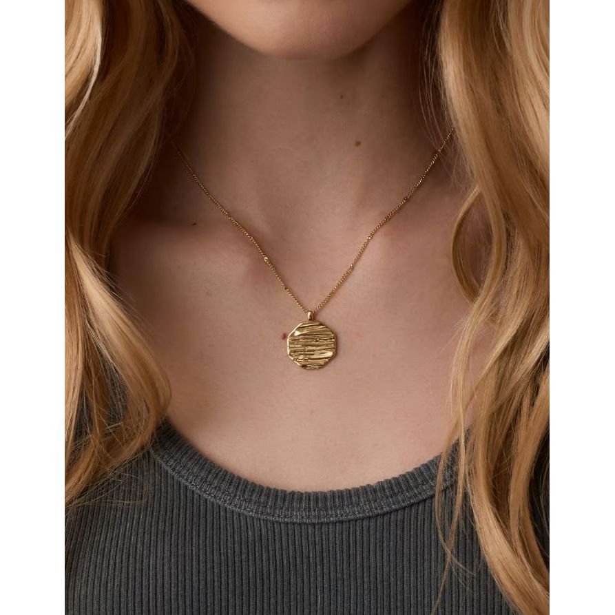 This beautiful, gold plated Sunset Coin Necklace is inspired by the beautiful Pacific Coast and features a rippling texture reminiscent of a sunset reflecting off the ocean. It's the perfect longer chain to complete your layered look.