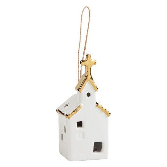 The Large Light-Up Church Ornament is a stunning addition to your holiday decor. Crafted from high-quality ceramic, this ornament showcases intricate electroplate gold detailing that adds a touch of elegance and sophistication. The LED interior light illuminates the ornament, creating a warm and inviting glow that will captivate everyone's attention. Measuring 4 1/2" x 2", this ornament is the perfect size to hang on your Christmas tree or display on a mantel or shelf. The twine hanger adds a rustic charm, allowing you to easily hang it wherever you desire. Plus, with the included battery, you can enjoy the enchanting light display right out of the box. Whether you're looking to enhance your own holiday decorations or searching for a thoughtful gift, the Large Light-Up Church Ornament is a must-have. Its timeless design and mesmerizing light make it a versatile piece that can be cherished for years to come. Add a touch of magic to your holiday season with this exquisite ornament.