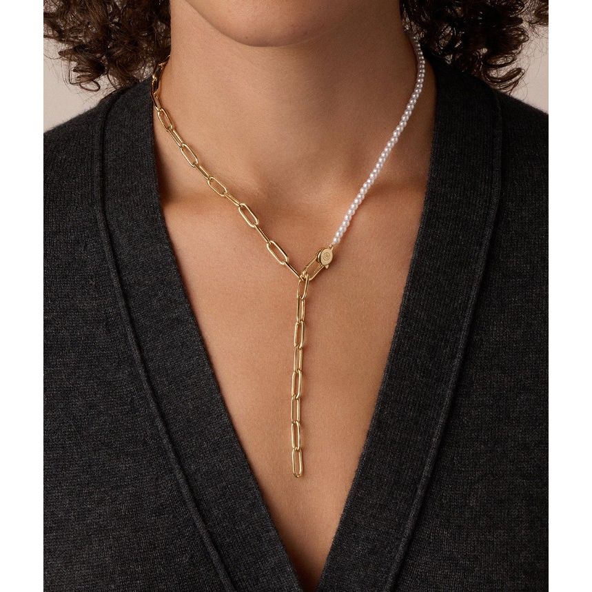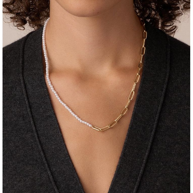Proving two styles are better than one, this 18k gold plated half and half necklace was designed to bring dimension and interest to your everyday stack. Featuring a chain that's half paperclip, half pearl, it's a trending style you'll reach for again and again.