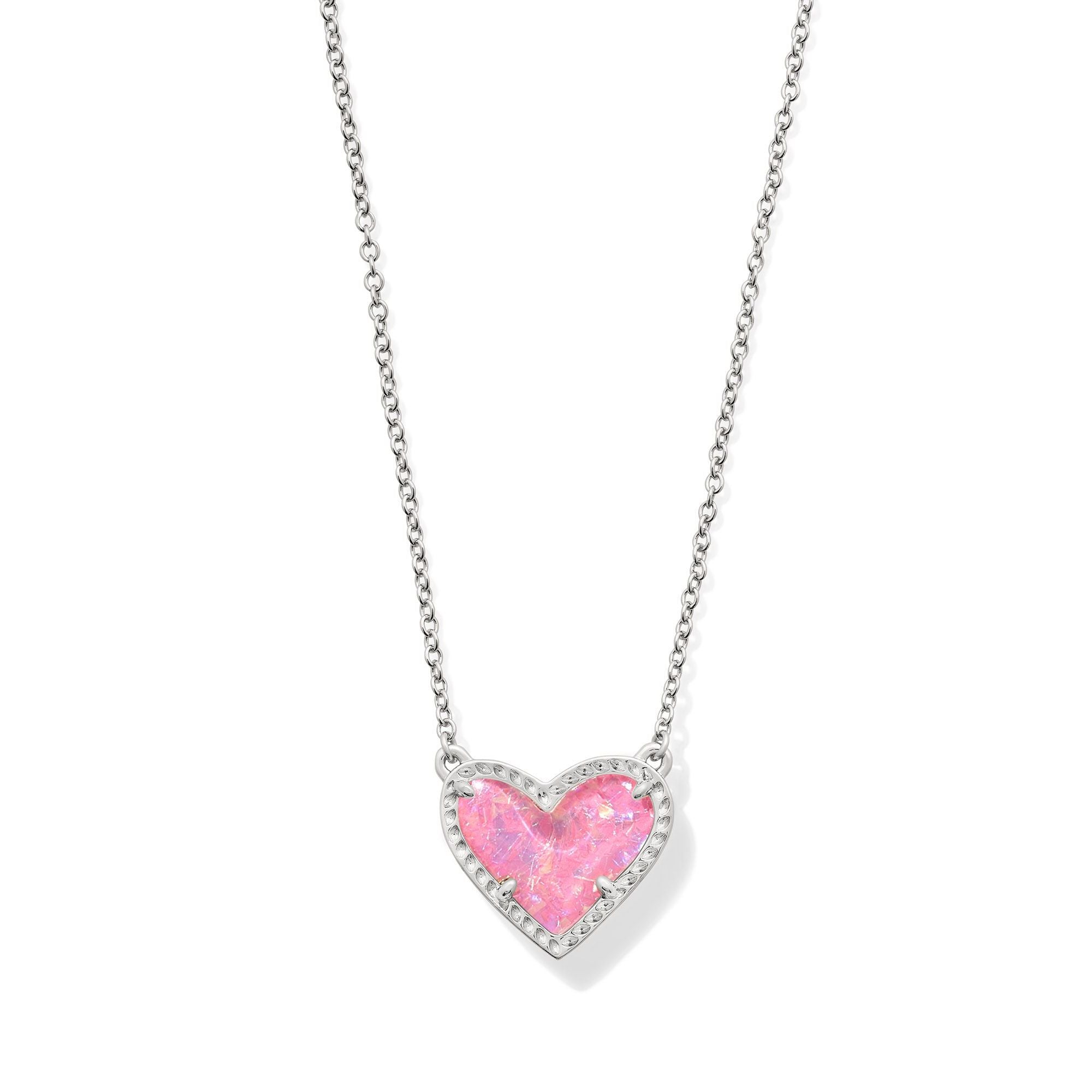 KENDRA SCOTT ARI HEART SHORT PENDANT NECKLACE SILVER PINK IRIDESCENT GLITTER GLASS