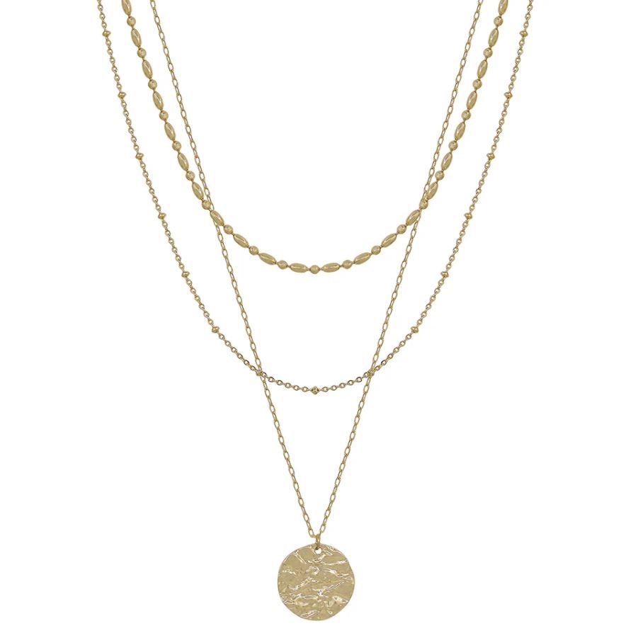 Delicate meets daring with this charming layered necklace that's ready to steal the show. Three graceful chains dance together at just the right length for everyday elegance. The star of the moment? A shimmering coin pendant that catches the light and adds just enough personality to elevate any outfit.