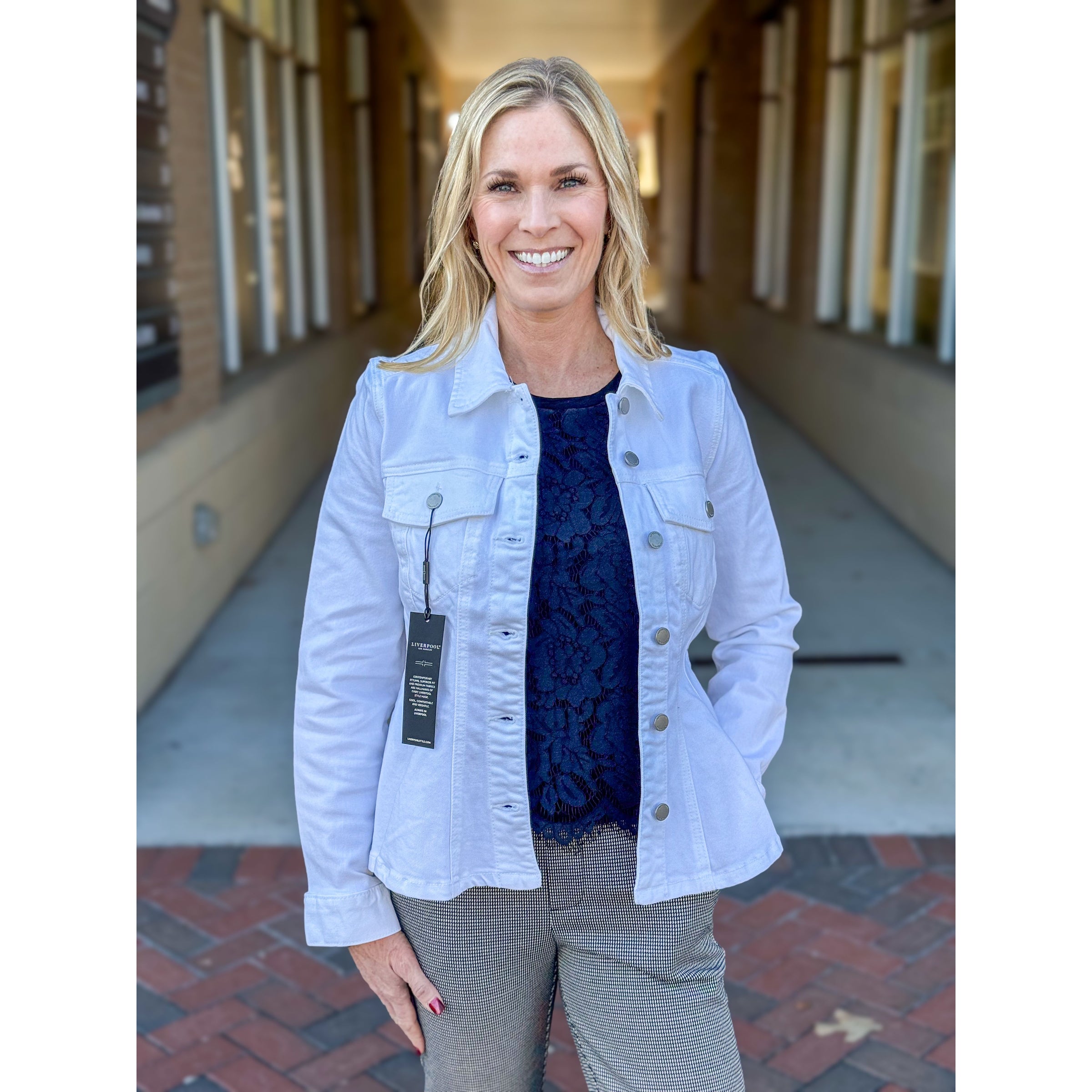Experience timeless style with a contemporary edge. This Liverpool trucker jacket features a refined fit-and-flare design that flatters your silhouette with a tapered waist and subtle hem flare. Constructed from premium stretch denim, it delivers all-day comfort without sacrificing its crisp, polished appearance. Layer effortlessly over any piece for an understated yet impactful addition to your wardrobe.