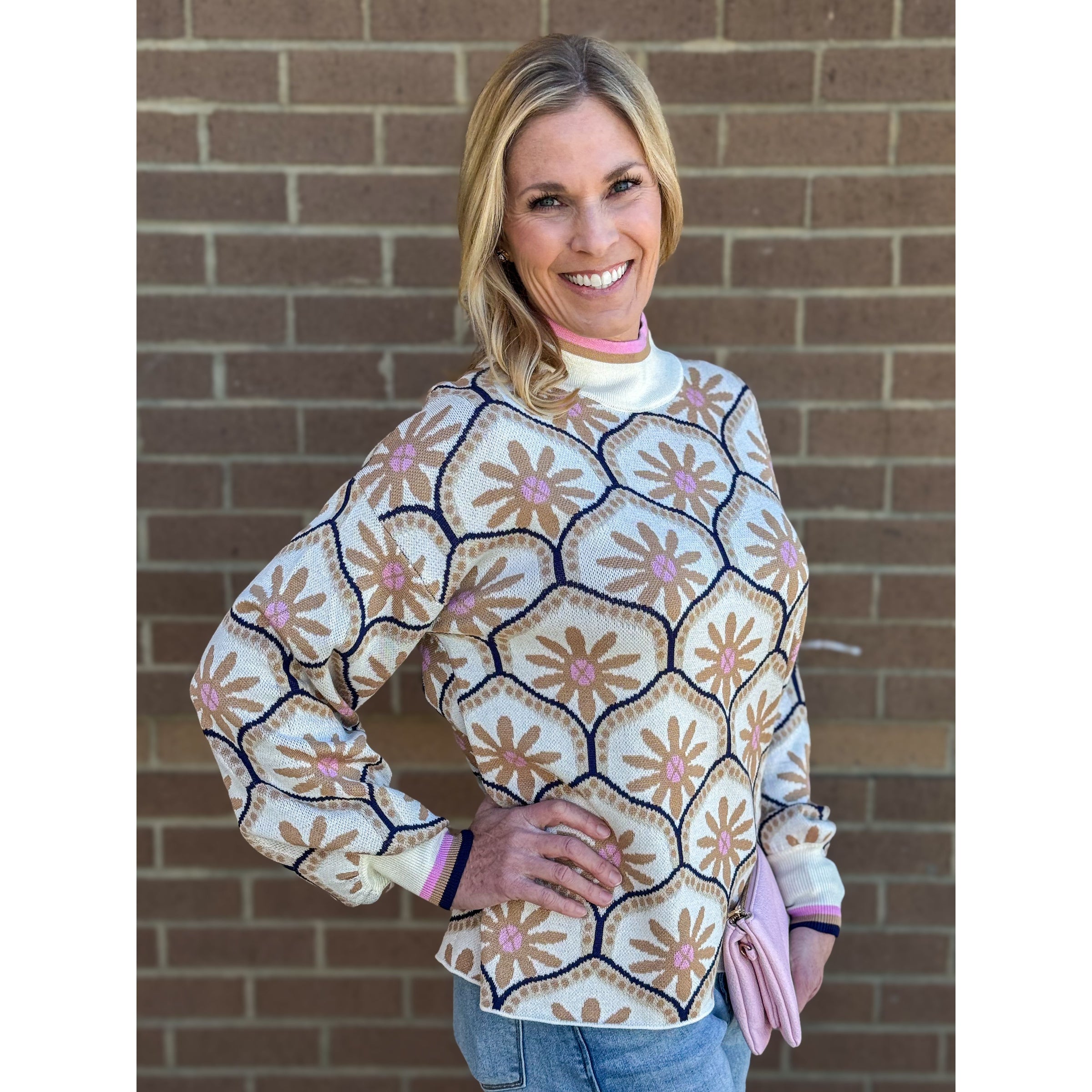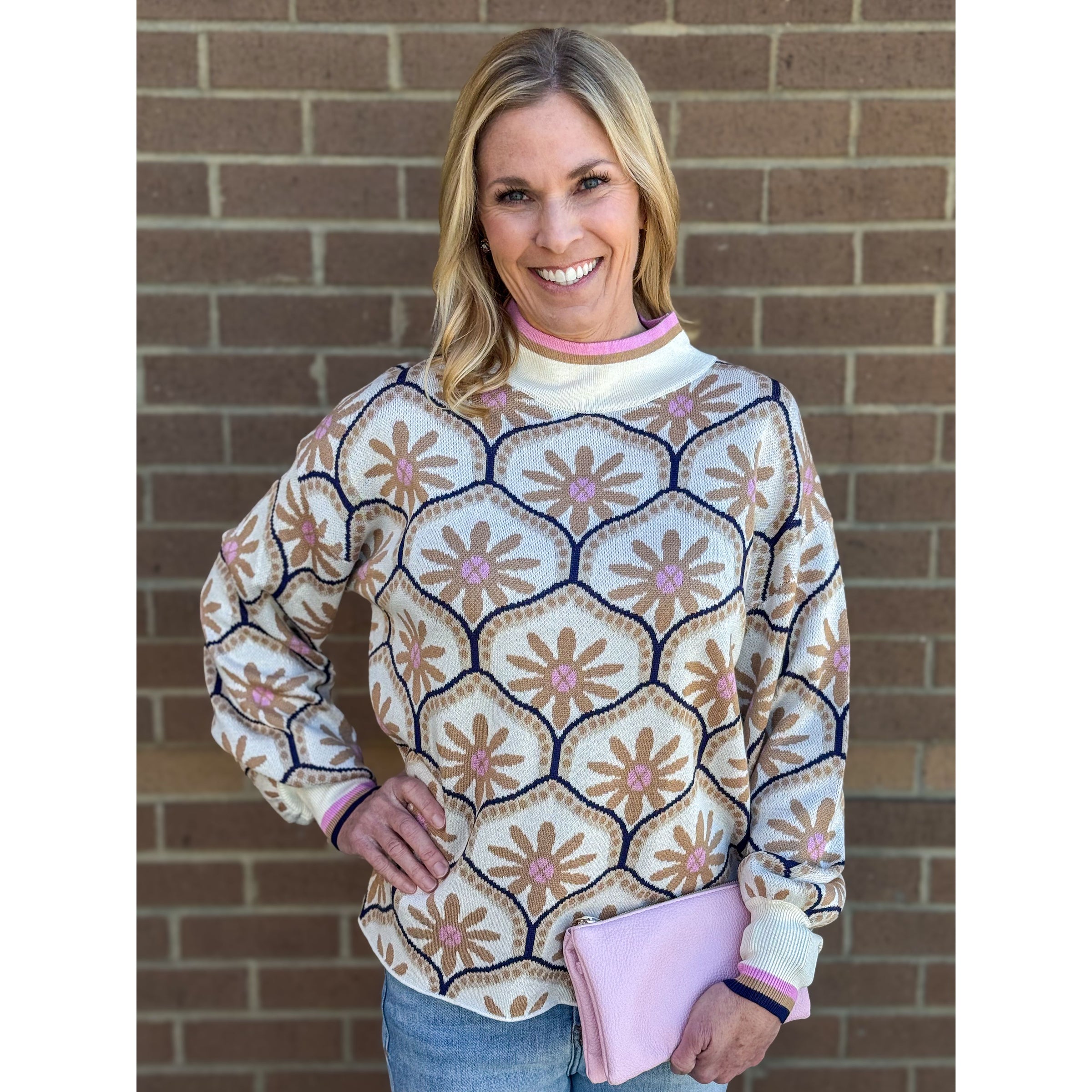 The Anne sweater brings effortless sophistication to your everyday rotation. Featuring a striking geometric floral motif in cream, tan, pink, and navy, this mock neck style pairs beautifully with dark denim or tailored trousers. Balloon sleeves with banded cuffs add a contemporary twist, while the straight hem keeps the silhouette polished and versatile. Layer it with simple gold jewelry for a look that feels both timeless and right now.