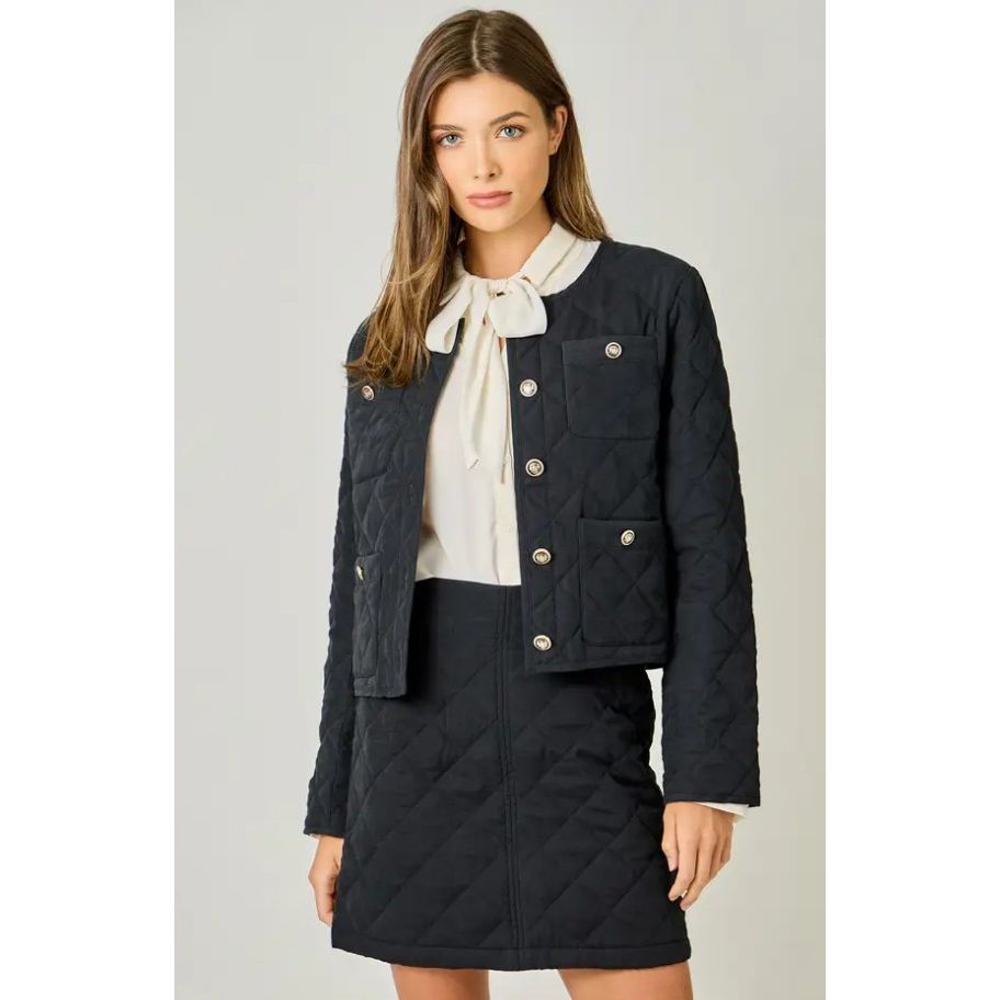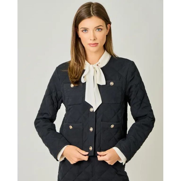 The Cammie Quilted Jacket in Black offers a clean button-down design with a graceful round neckline. Equipped with chest and bottom pockets, it combines functionality with a refined silhouette for effortless sophistication. The decorative gold buttons add a unique touch to this short, quilted jacket look.