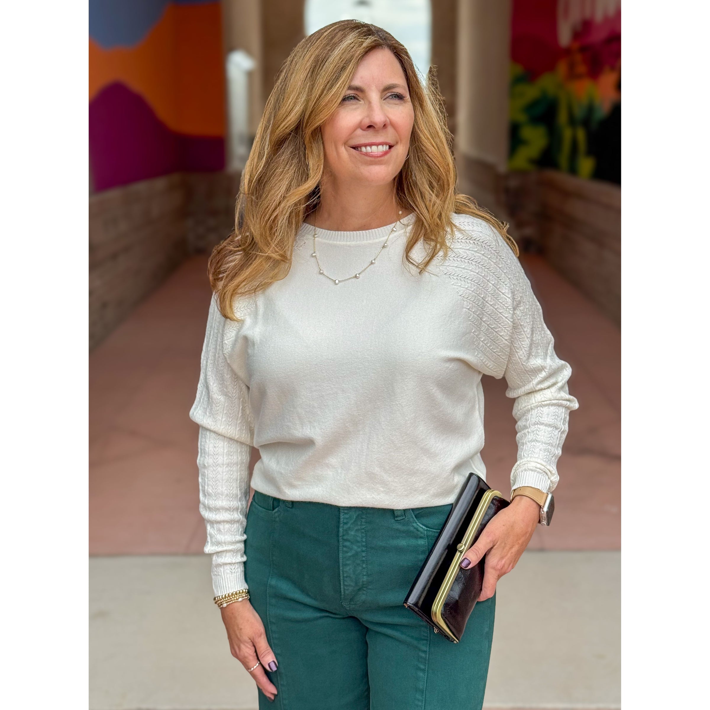 The Delia Fine Gauge Sweater in French Vanilla blends classic elegance with feminine detail through its braided pointelle sleeves. Crafted from super soft fabric, it offers cozy comfort while maintaining a timeless silhouette. Perfectly paired with dark slacks or coated denim, it effortlessly elevates your wardrobe. Complete the look with simple gold jewelry for refined sophistication.