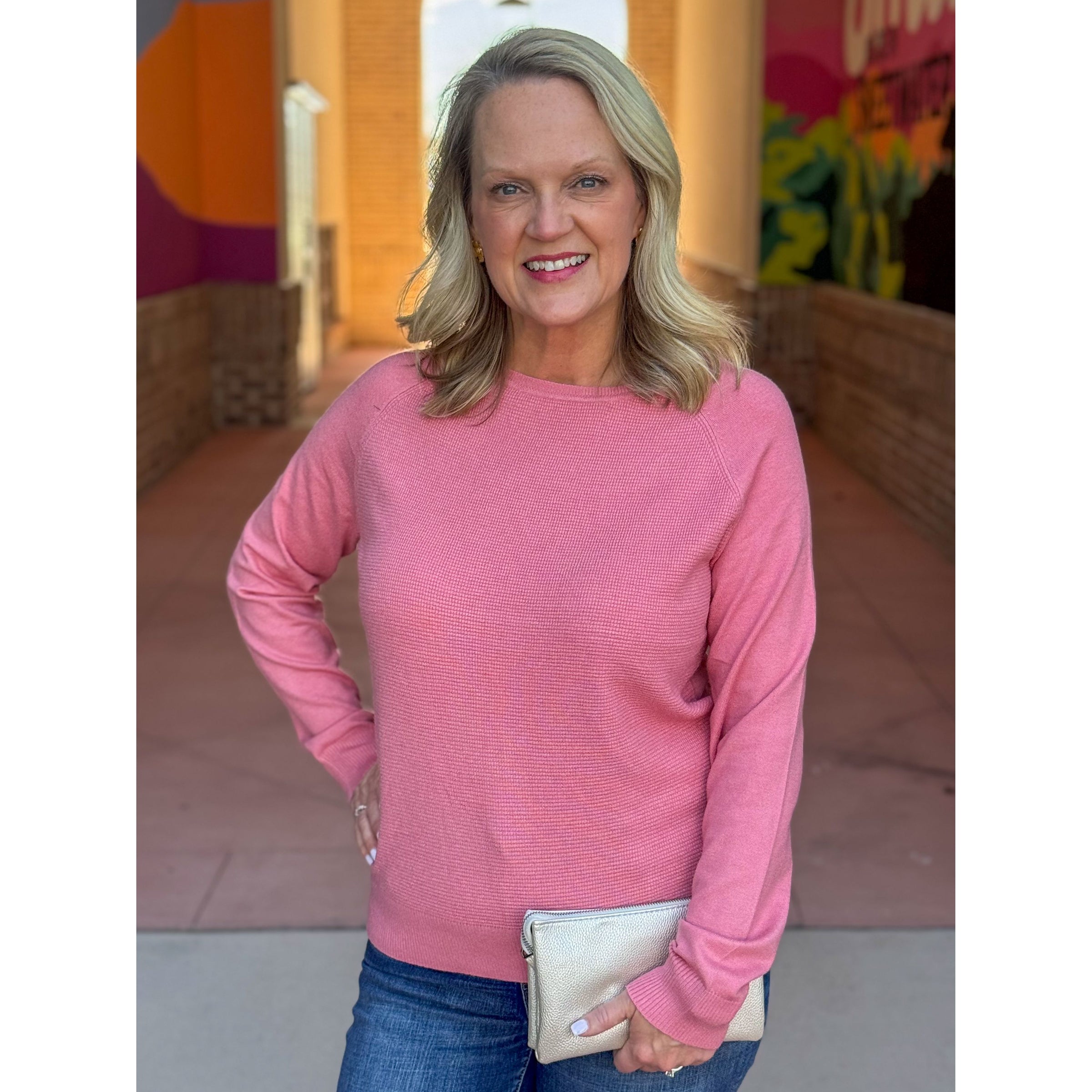The Dinah Wide Crew Neck Pullover Sweater in pink is your new cozy crush! Featuring a soft waffle-knit front and smooth mixed media back, it’s lightweight yet never see-through. Throw it on with denim or your favorite yoga pants for effortless comfort that’s ready for whatever the day brings.