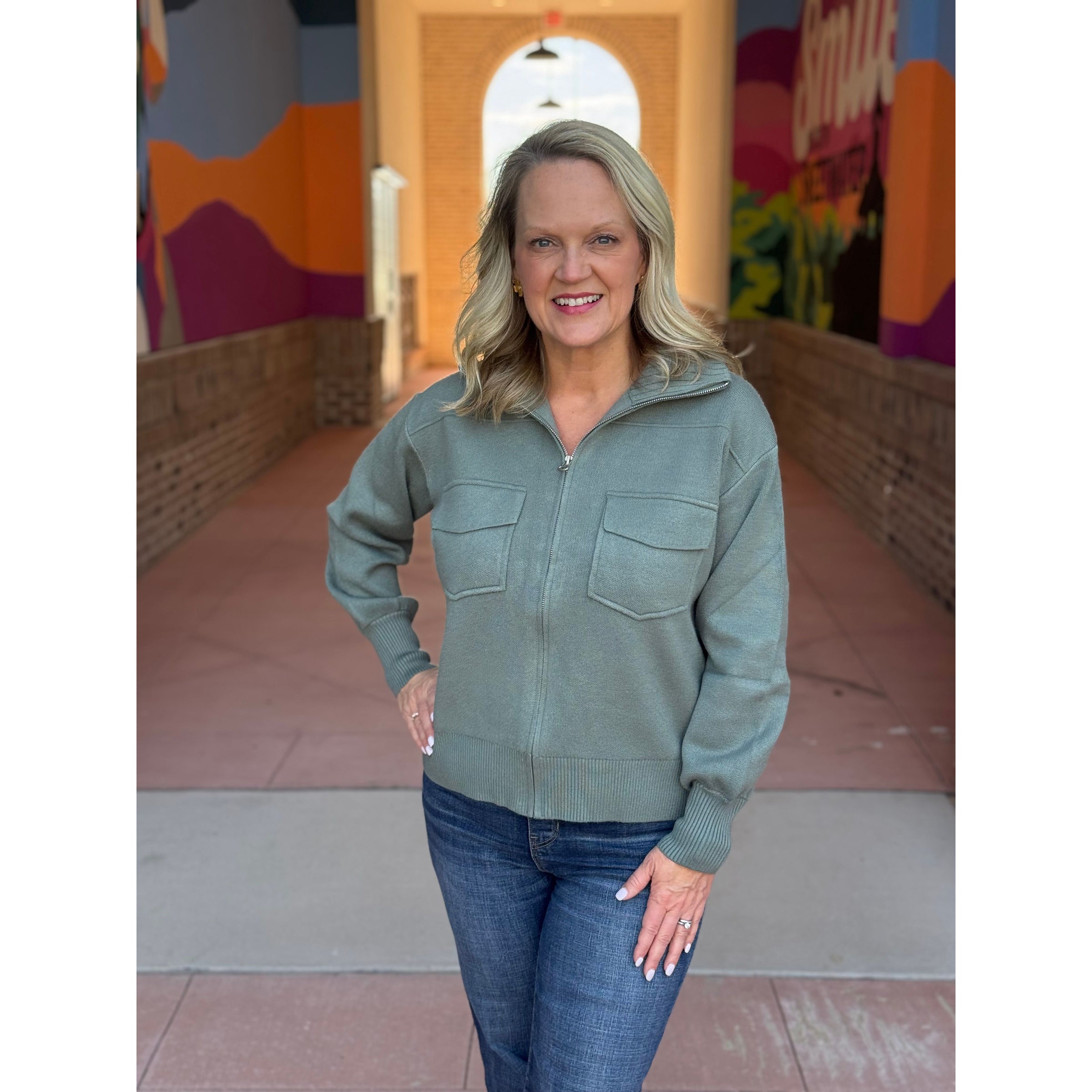 Stay cozy and stylish with the Gizelle Mock Neck Sweater Jacket in Dusty Jade. Featuring a playful collared design, double chest pockets, and a zipper down the front, this soft, long-sleeve jacket is perfect for those cooler days. Zip it up solo or layer it over your favorite tees for easy weekend wear. Pair it with dark denim for a look that’s ready for errands or laid-back hangouts.