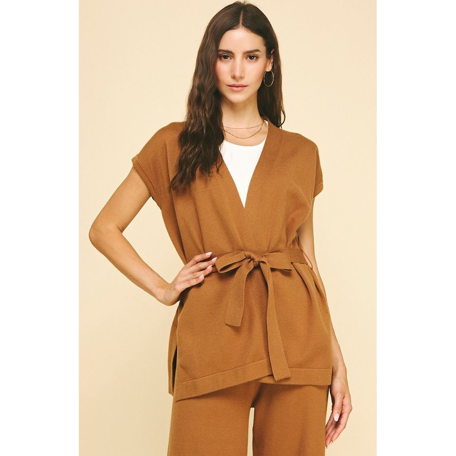 This Helena Front Tie Blazer Vest in camel offers a refined silhouette with its cap sleeves and subtle side slits, ensuring both elegance and ease of movement. The matching fabric belt cinches the waist for a tailored fit. Ideal as a layering piece, this vest boasts a polished, sophisticated look perfect for a day at the office or a fun night out on the town.