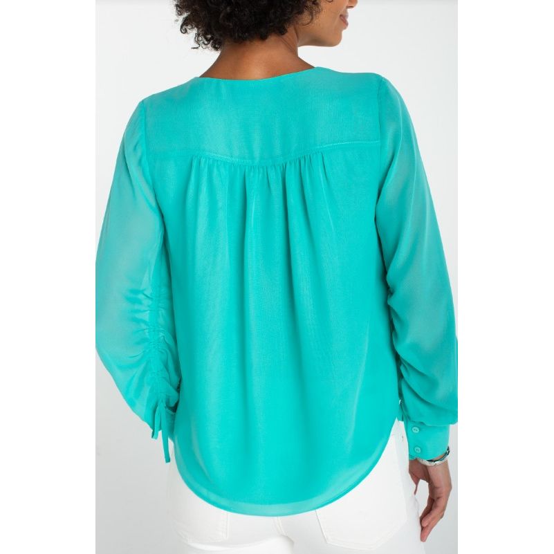 Experience refined elegance with this Liverpool Los Angeles long sleeve blouse in a stunning Waterfall Teal. The drawstring-cinched sleeves provide a customizable fit and ease of movement, while the fluid woven fabric transitions effortlessly from professional environments to casual occasions with subtle sophistication.