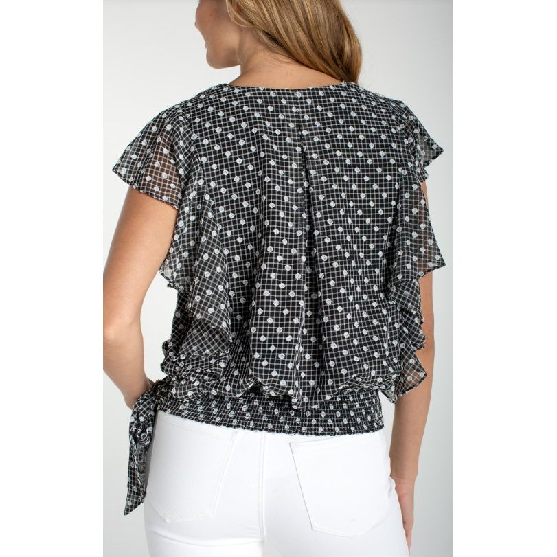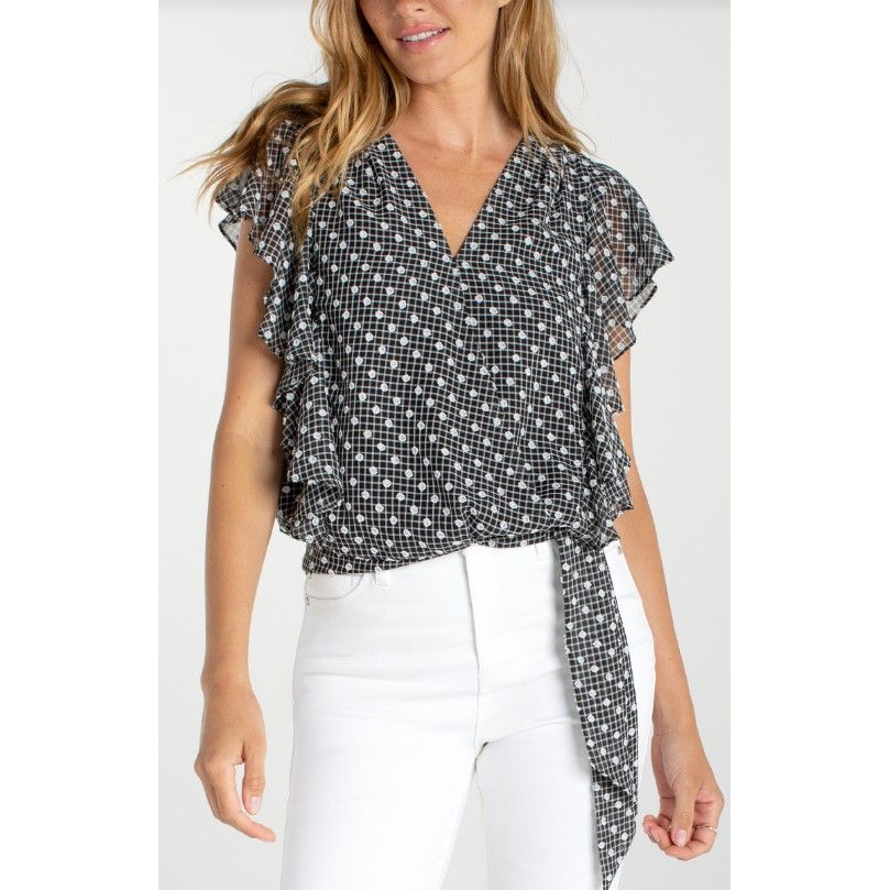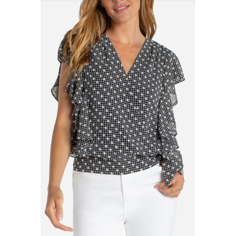 Liverpool Los Angeles Short Ruffle Sleeve Draped Front Woven Blouse - Black/White Plaid