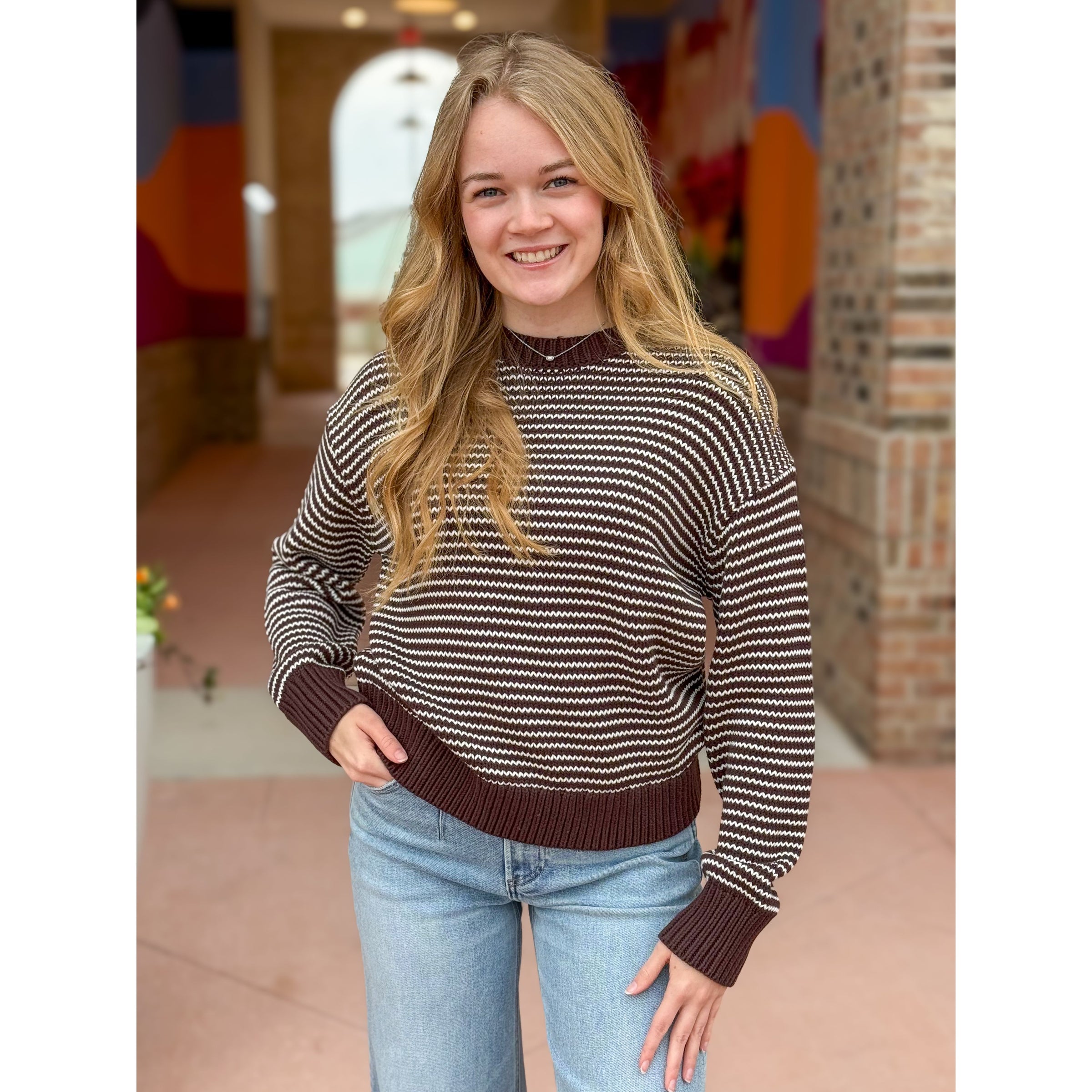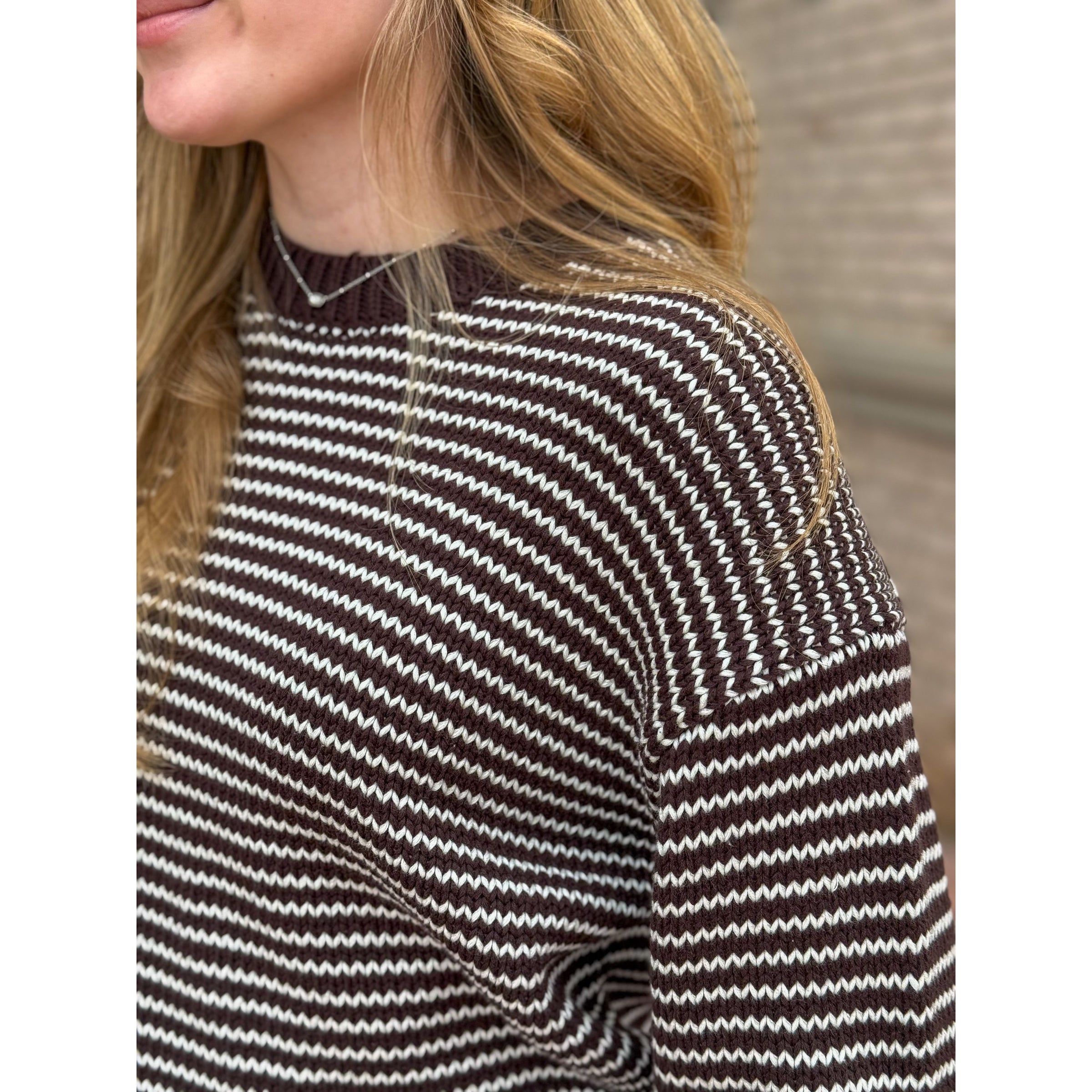 A timeless silhouette, Aura offers a classic crew neckline and an easy, relaxed fit that drapes effortlessly over denim, trousers, or skirts. Knit from 100% cotton, it’s soft yet structured—ideal for layering or wearing on its own. Mocha, a rich brown stripe mix, adds warmth and versatile polish to any look.