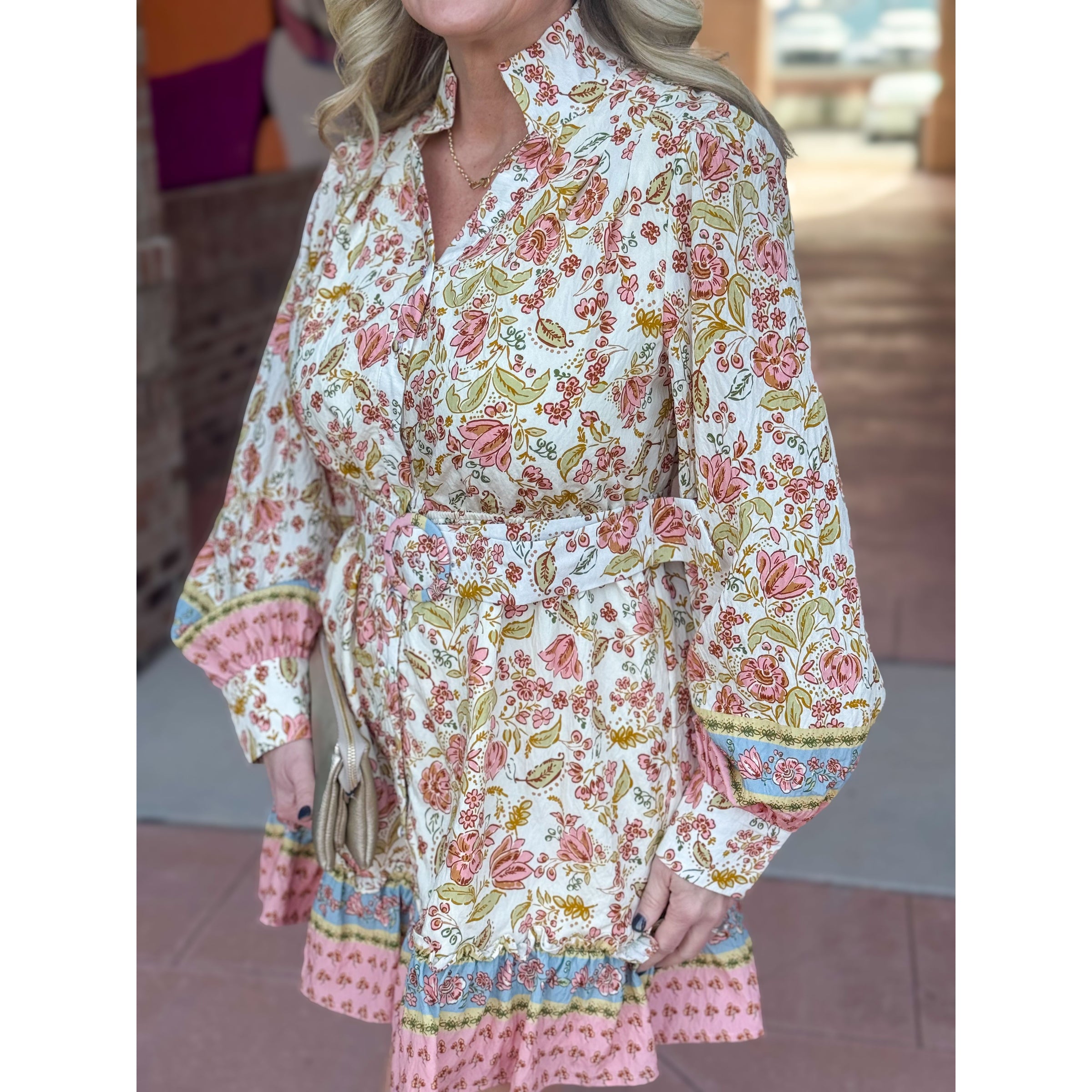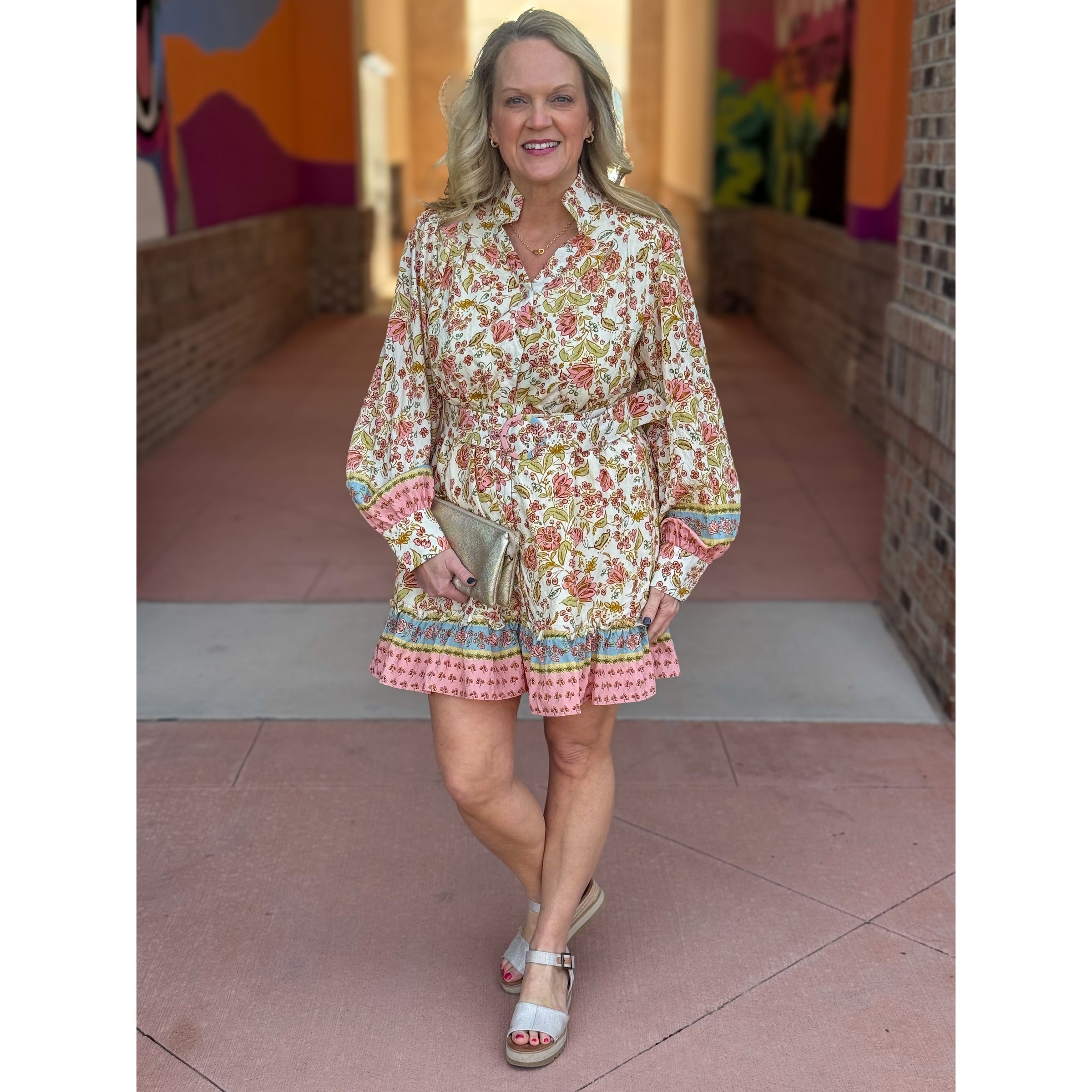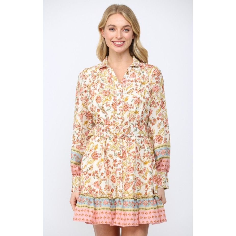 Shauna is the dress that does it all—literally. Rock the border print in cream and multi-tones, cinch it with the wide belt and clasp for an instant waist moment, then flip that collar up or down depending on your vibe. Button-down front means easy layering, elastic waist keeps you comfy all day, and that tiered border print at the hem? Chef's kiss. Dress it up with heels or keep it casual—this one's your new go-to.