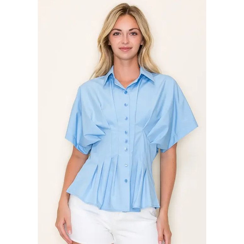 Crisp light blue button-up blouse with pleated waist detailing and modern Dolman sleeves. The tailored silhouette offers a polished look that transitions seamlessly from office to evening wear. A versatile wardrobe staple designed for sophisticated, all-day comfort.