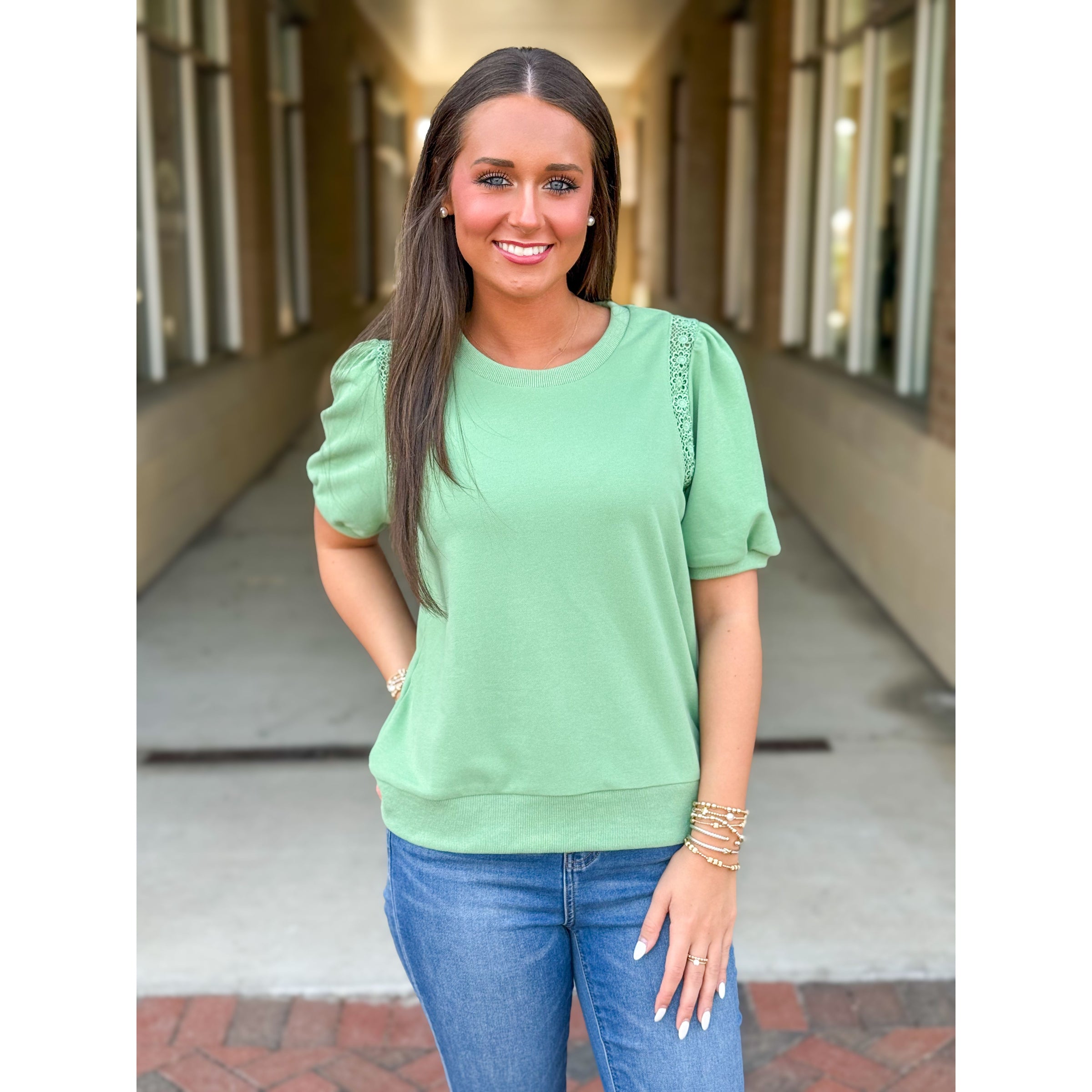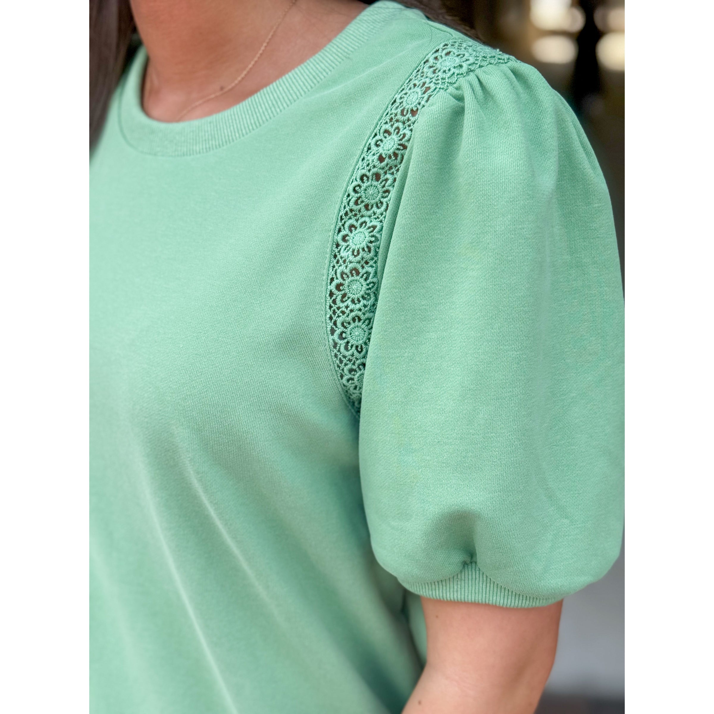 Eva Crochet Lace Puff Sleeve Casual Top - Sea Green