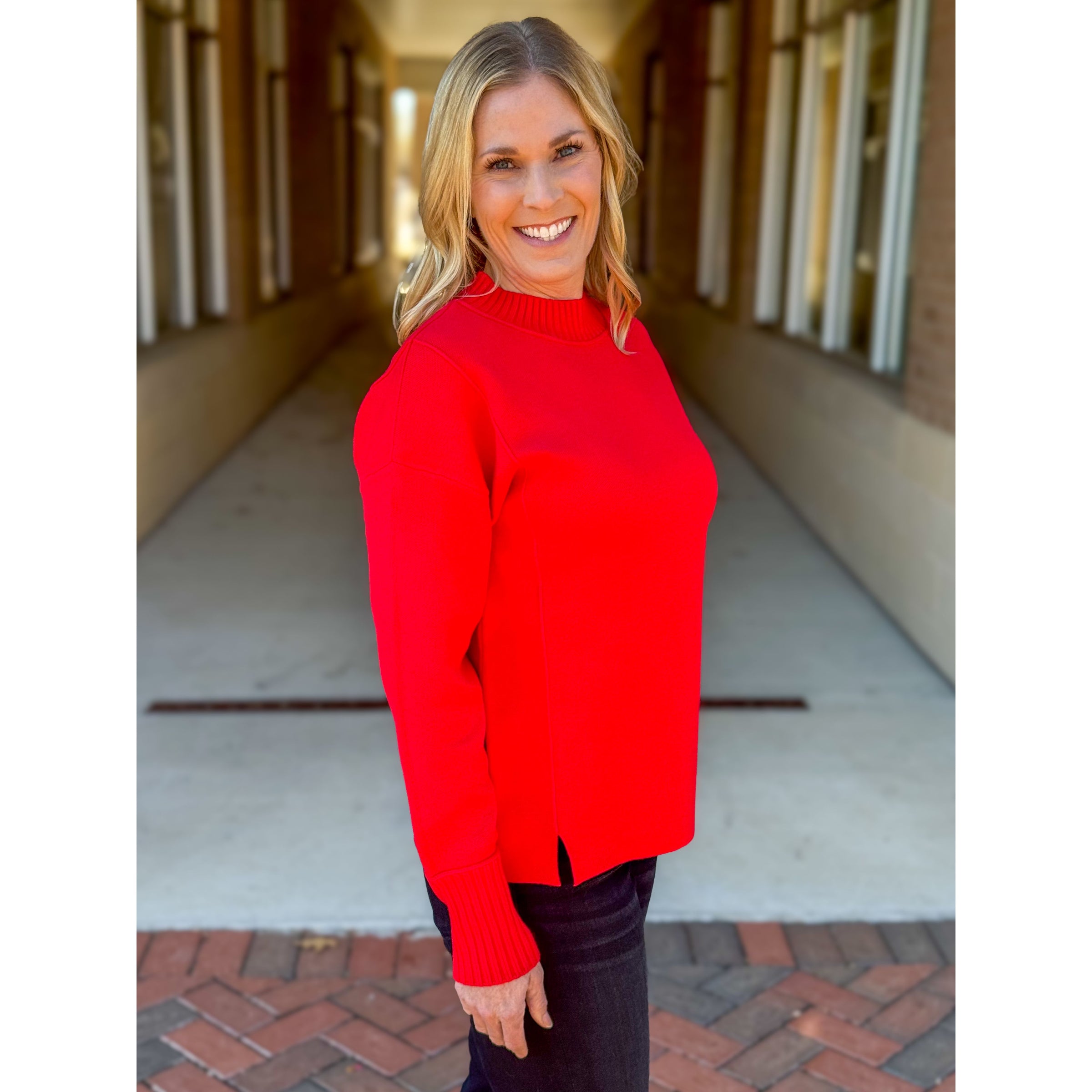 The Jodi Mock Neck Pullover Sweater in this stunning red hue features a sleek mock neck and subtle side slits, delivering a streamlined look with effortless comfort. Perfect for dressing up or down, this can be your next go-to sweater for the office, holiday party, or a girls' night out. Pair it with your favorite denim or black pants for varying looks!