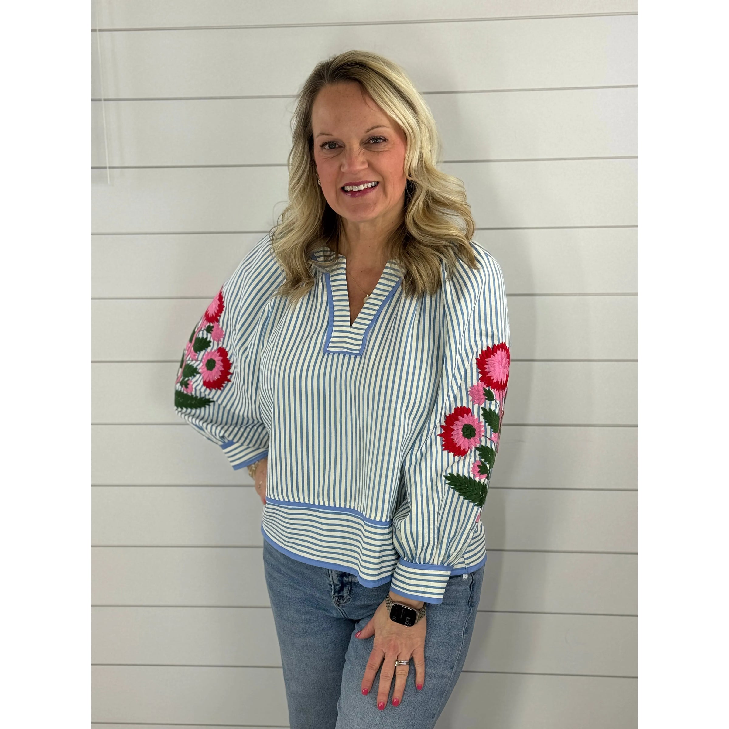 Elevate your everyday style with this stunning blue striped blouse featuring romantic, floral-embroidered puff sleeves. The breathable woven fabric and flattering V-neck collar offer effortless elegance from brunch to the boardroom. This lightweight, non-sheer essential is the perfect blend of boho-chic and classic sophistication.