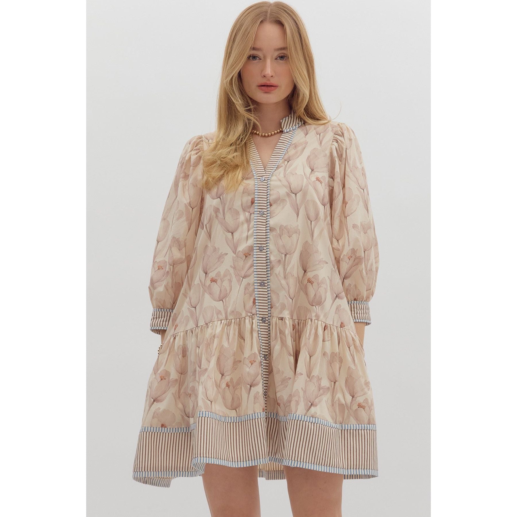 Gianna Floral Print Contrast Stripe Mini Dress - Ecru