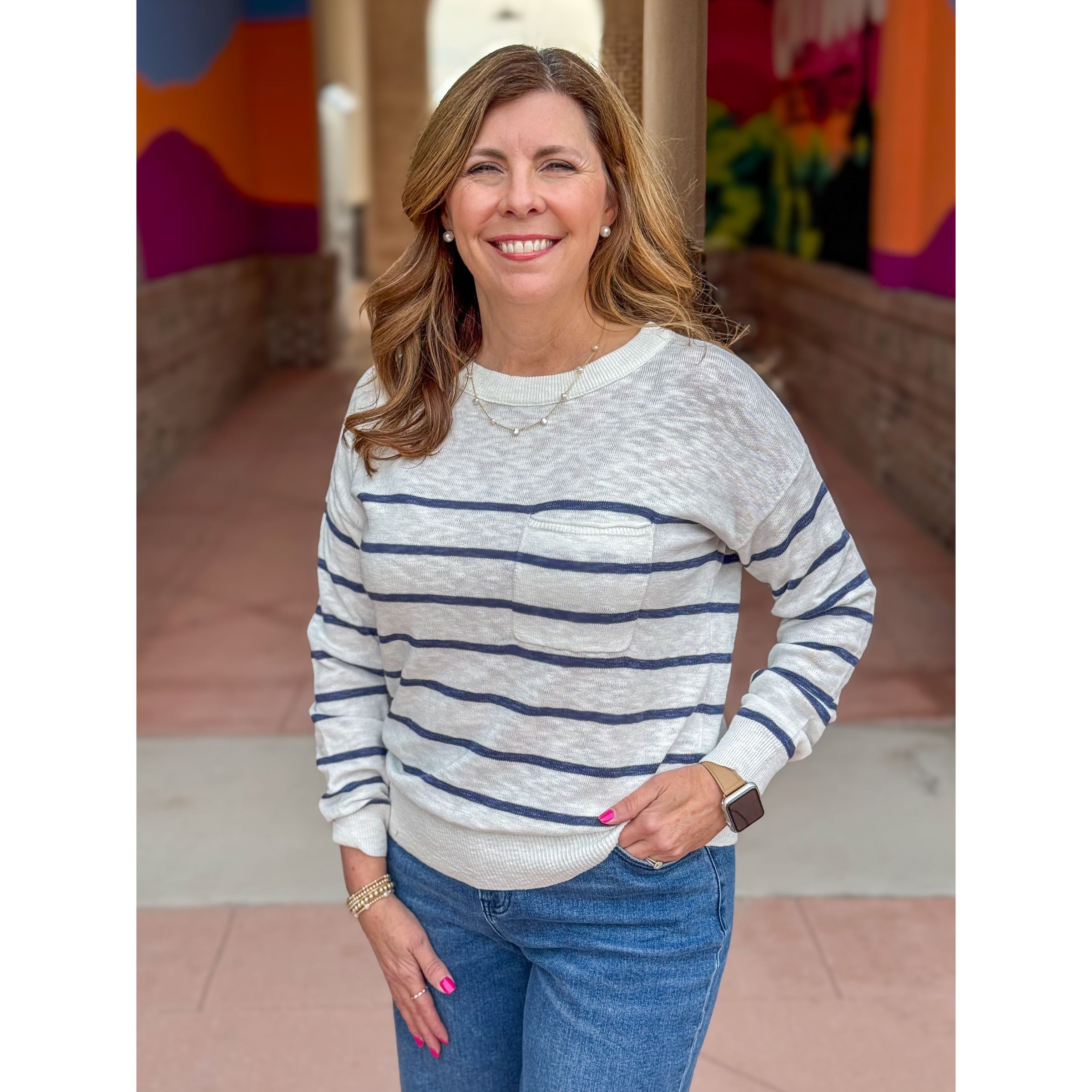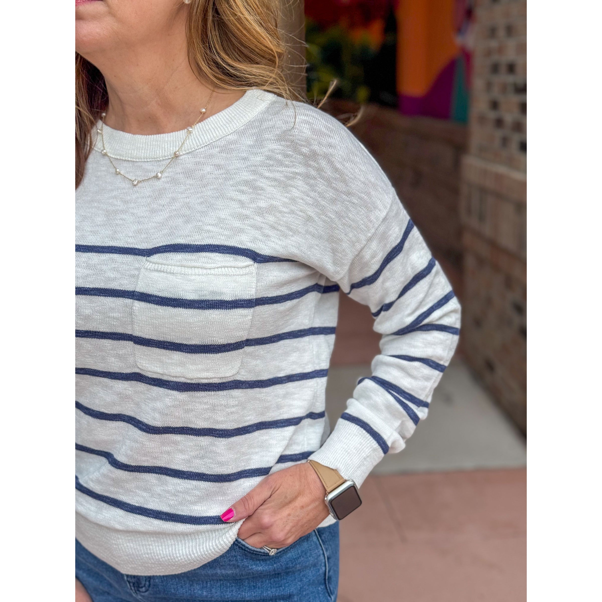 Joni Striped Sweater With Front Pocket - Marine Blue