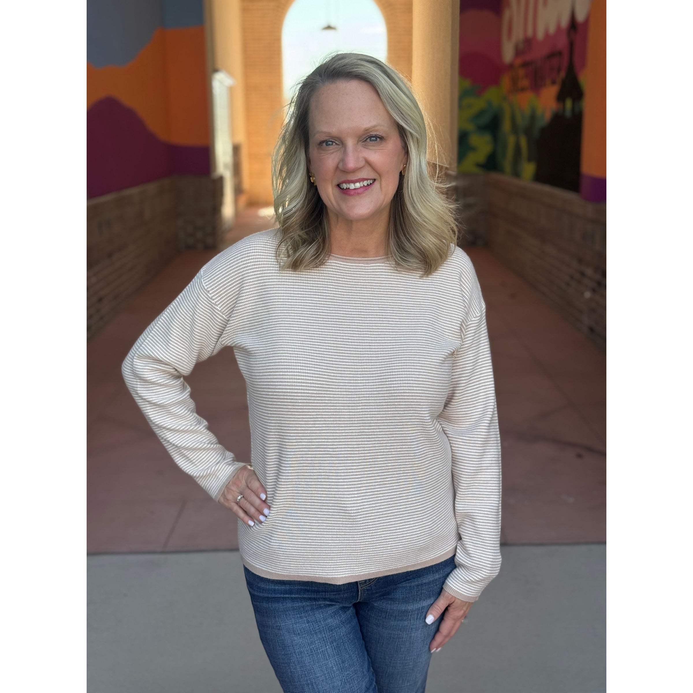Lillie Waffle Textured Pinstripe Long Sleeve Sweater - Taupe