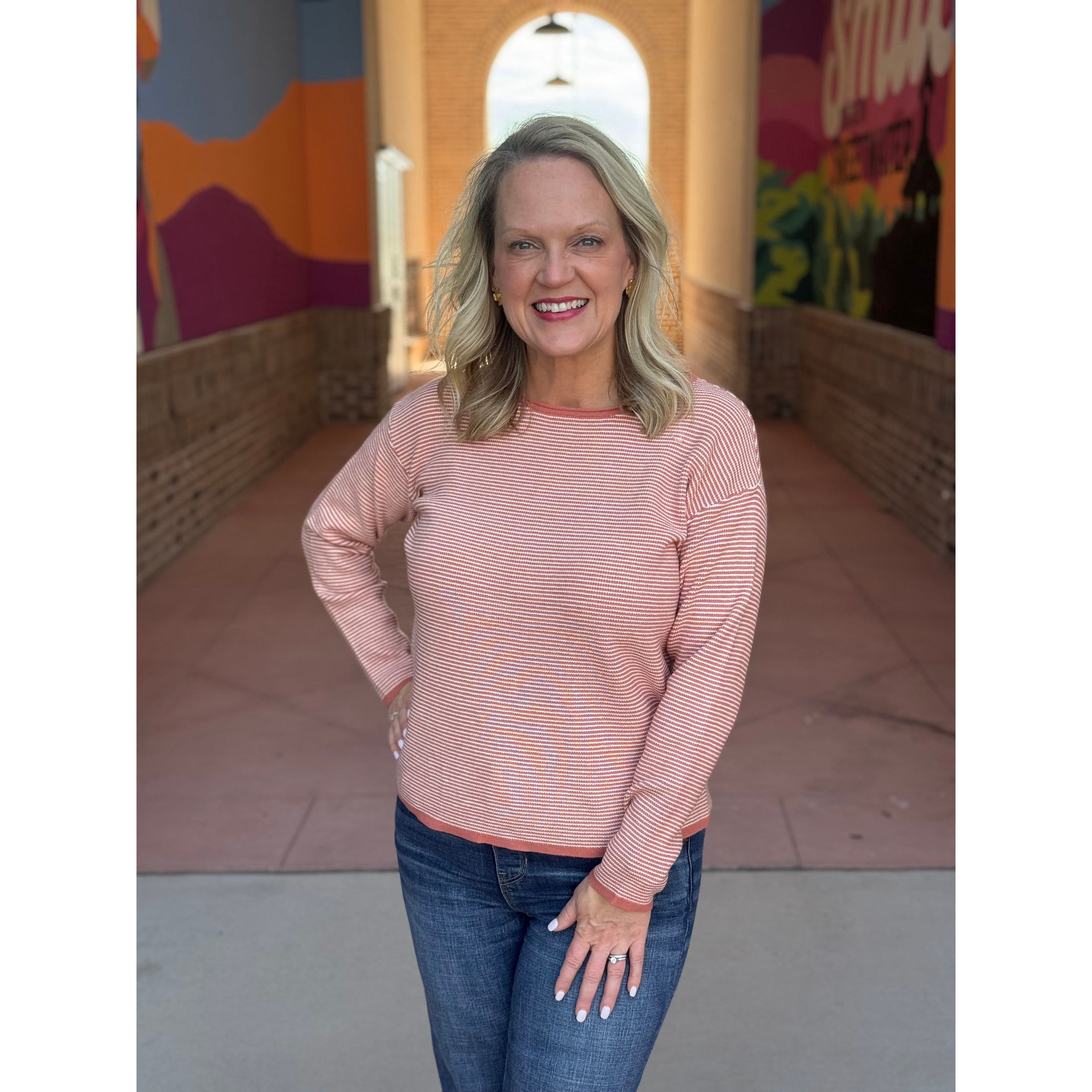 Lillie Waffle Textured Pinstripe Long Sleeve Sweater - Terracotta