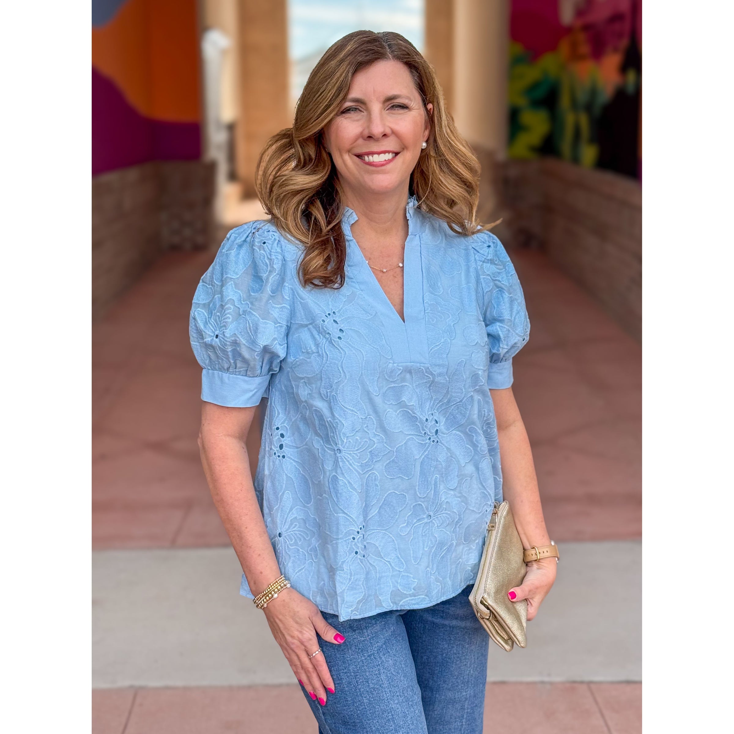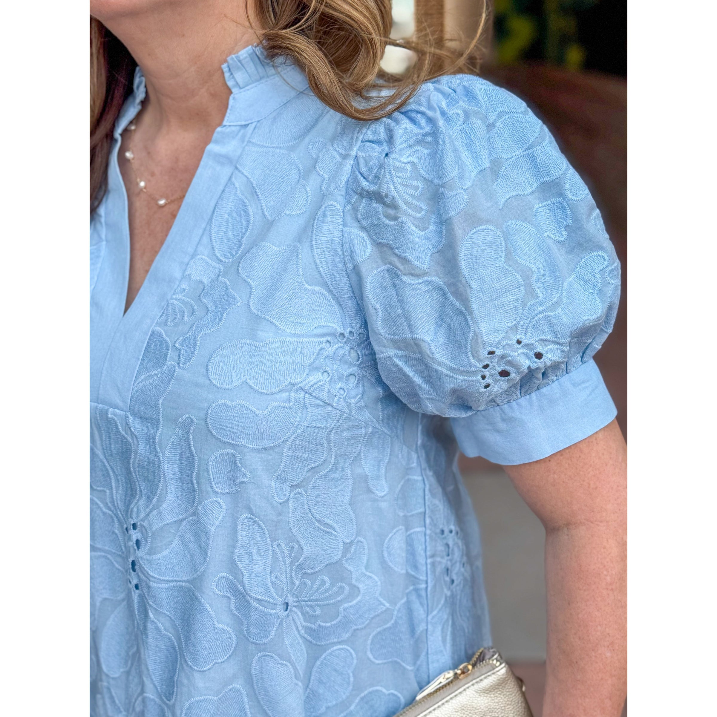 Marianne Floral Embroidered Puff Sleeve Top – Sky Blue