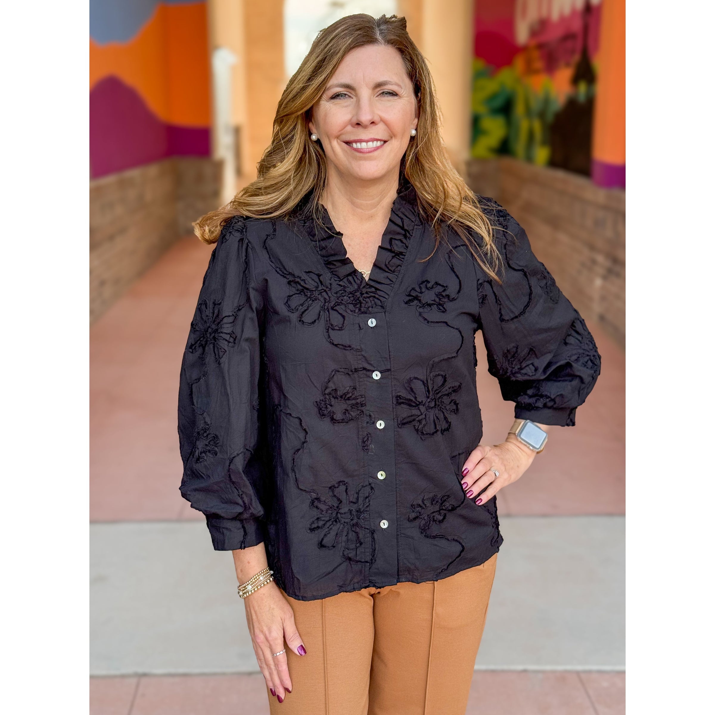 Reba Button Down Textured Floral Top - Black